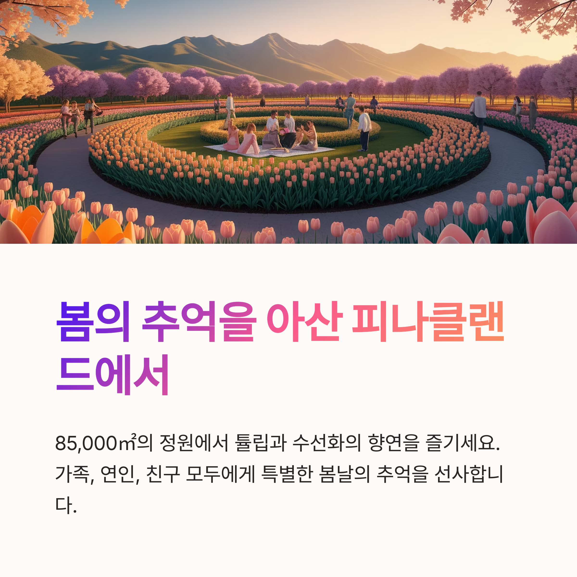 올해 봄에는 아산 피나클랜드에서 다양한 꽃과 자연의 풍경 속에서 힐링의 시간을 가져보세요.