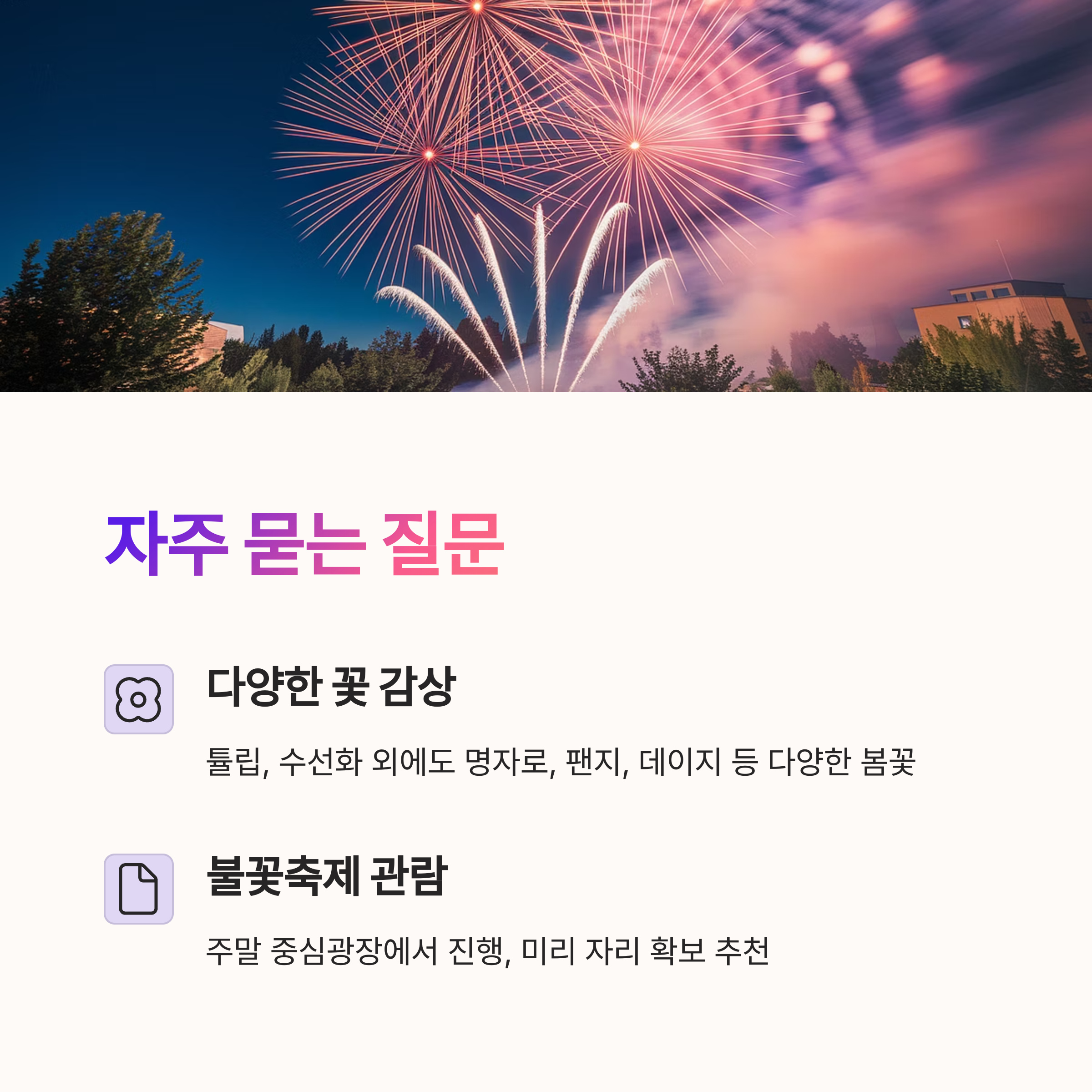 주말마다 열리는 불꽃축제는 봄나들이의 특별한 경험을 선사합니다.
