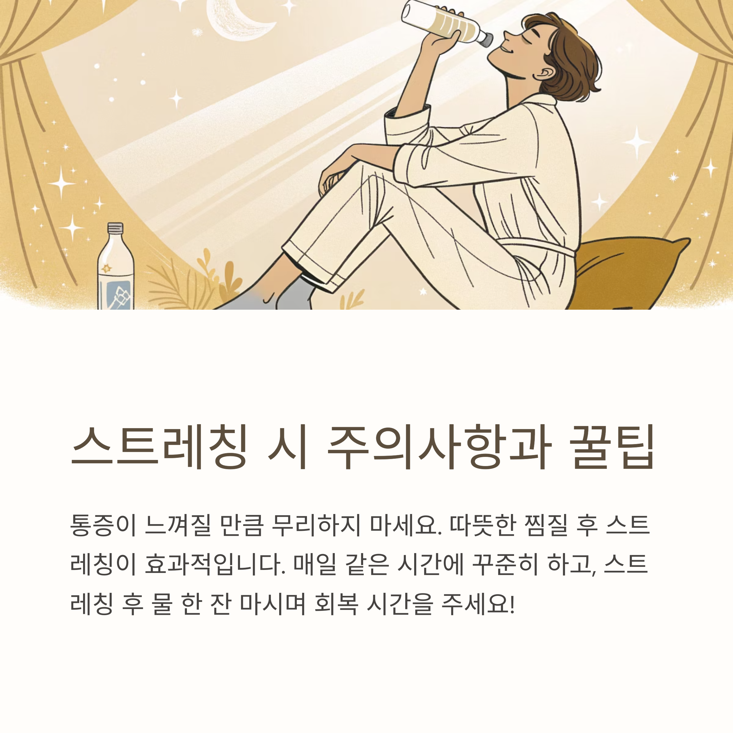 - 스트레칭 후에는 물 한 잔 마시며 회복 시간을 주세요!