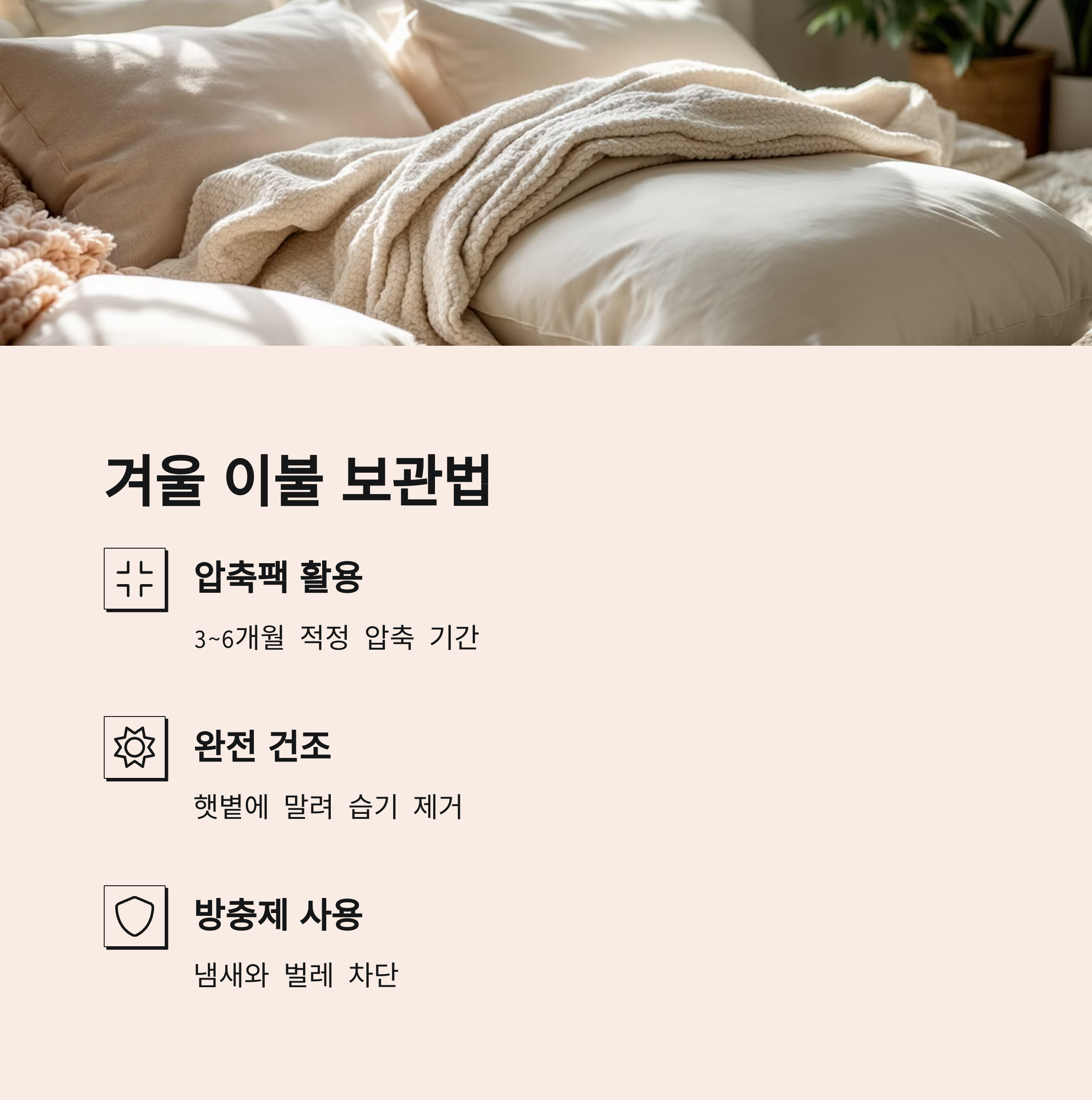 하지만 너무 오래 압축하면 솜이 눌려 복원력이 떨어질 수 있으므로, 3~6개월 정도가 적절하며, 통기성이 있는 커버에 넣어 보관하는 것도 추천됩니다.