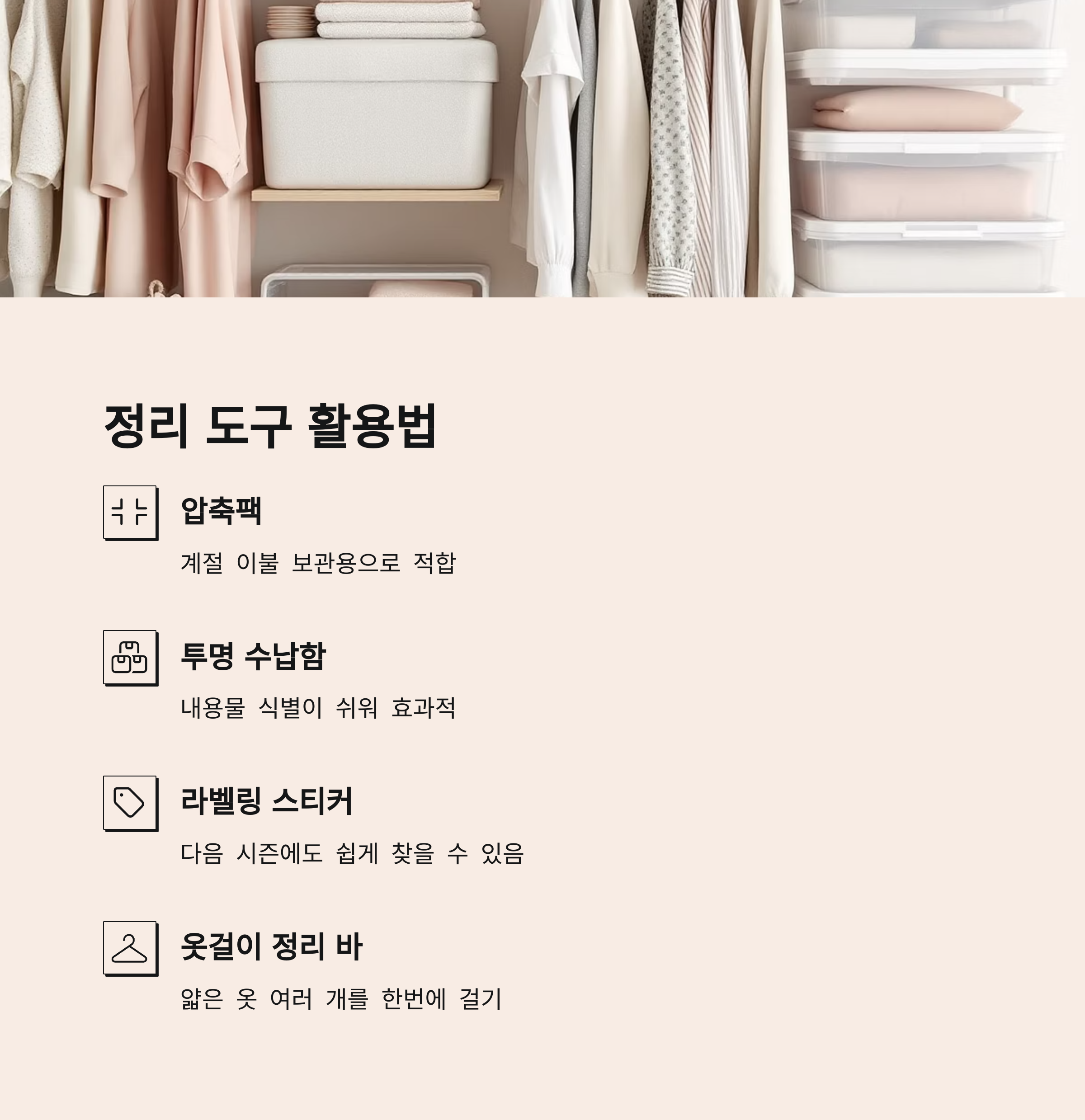 - 라벨링 스티커: 서랍 외부에 라벨을 붙이면 다음 시즌에도 쉽게 찾을 수 있음