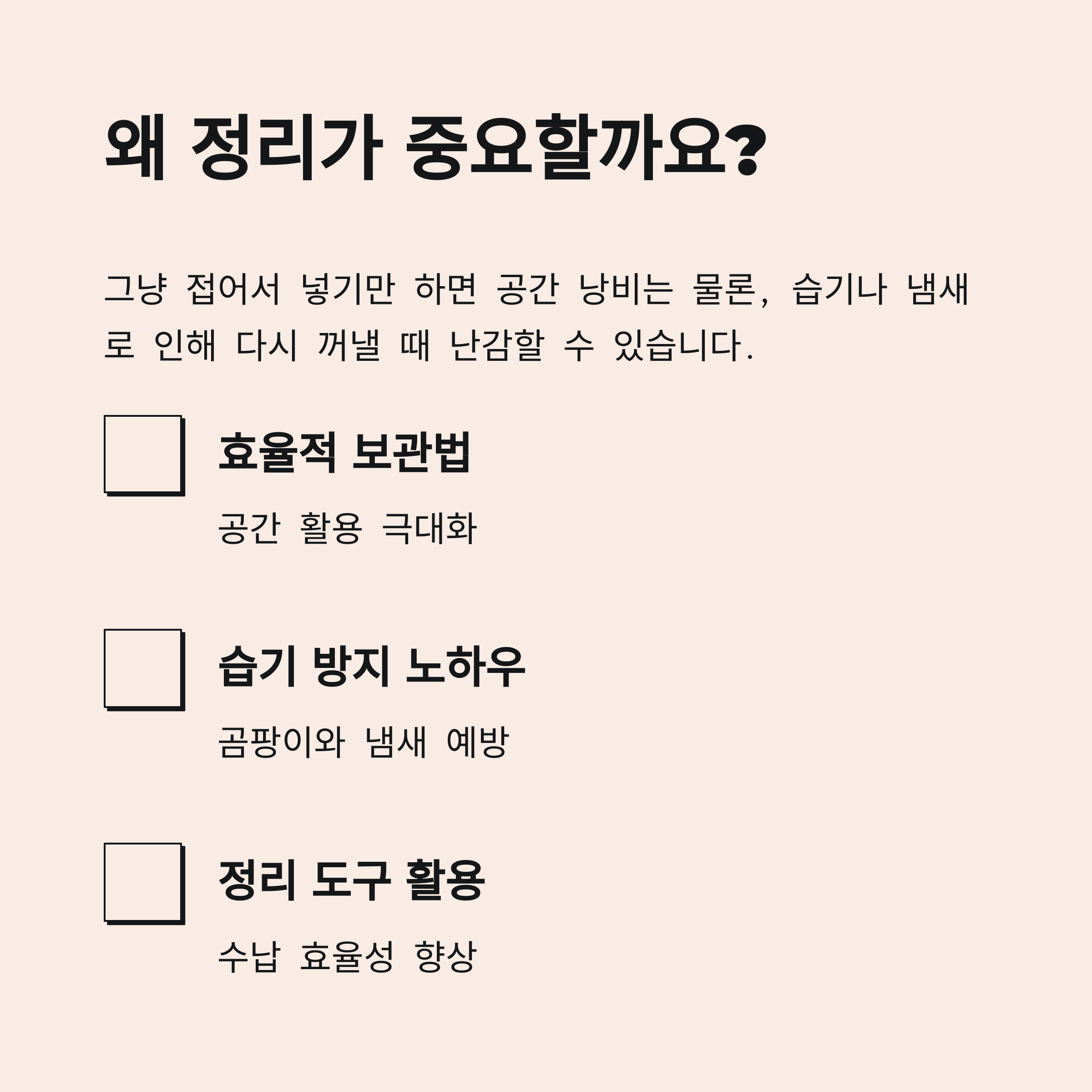 - 압축팩: 계절 이불 보관용으로 적합, 단 자주 꺼내는 옷은 부적합