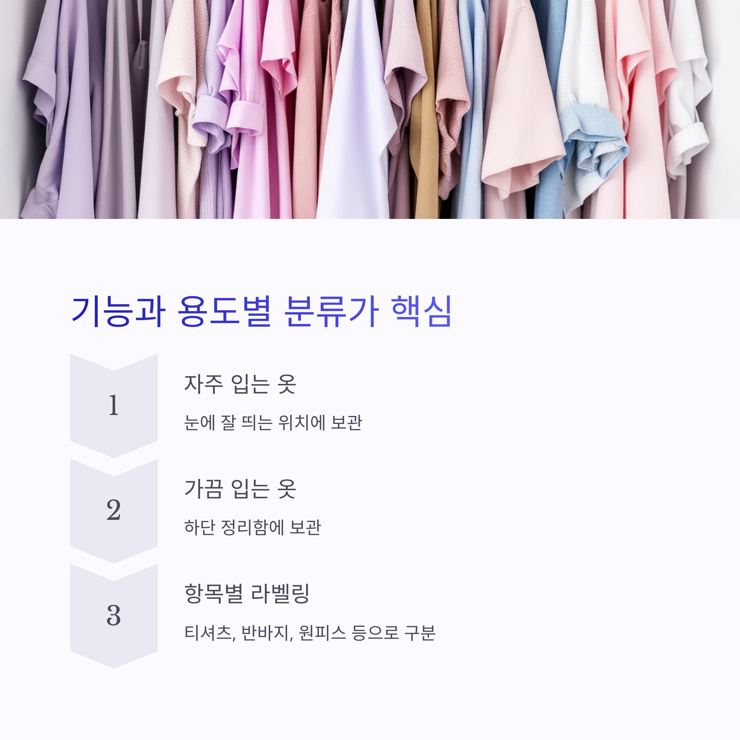 티셔츠, 반바지, 원피스, 아우터 등으로 항목을 나누고, 색상별로 정리하면 옷장을 열 때마다 기분까지 좋아집니다.