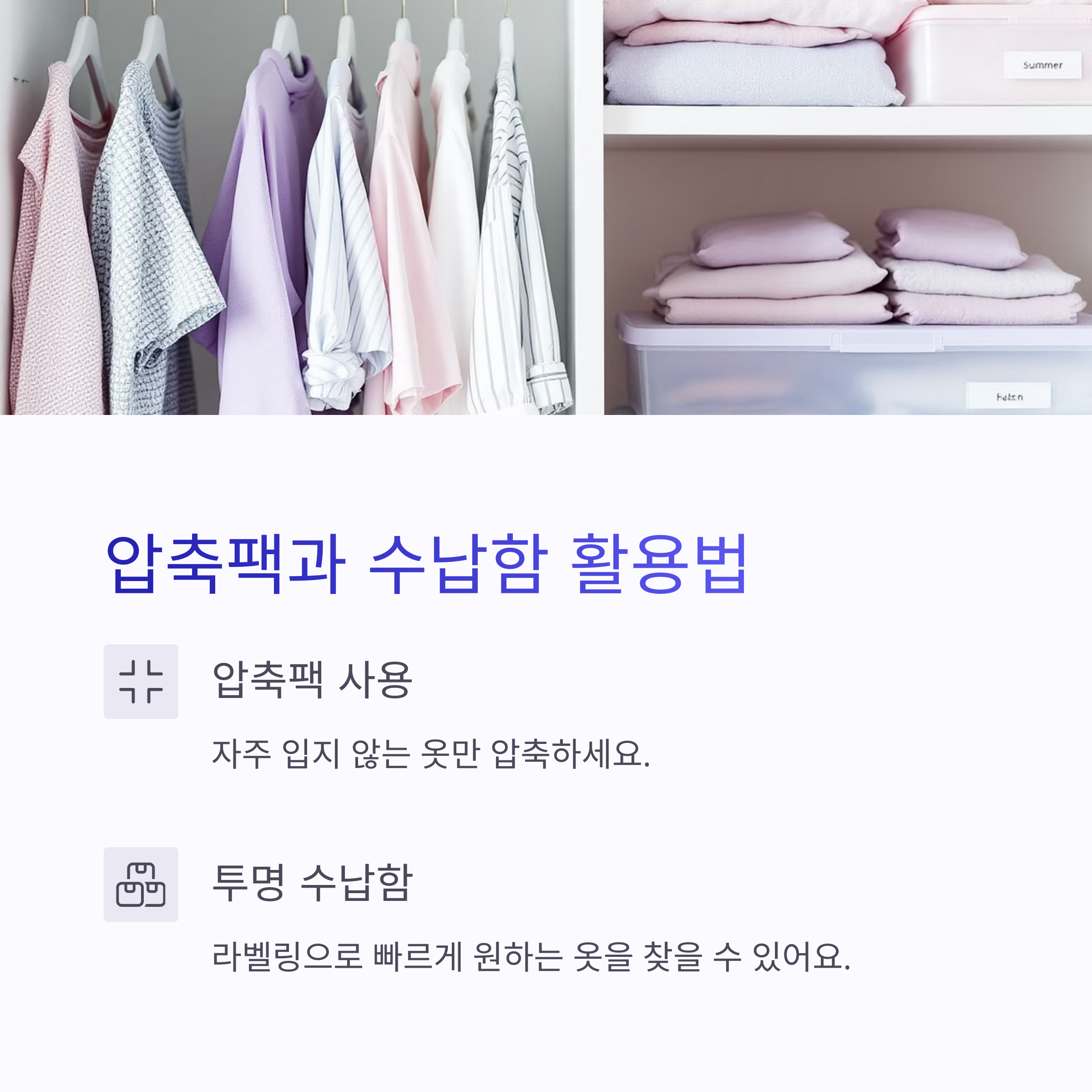 공간을 확보하면 여름옷이 쾌적하게 정리되고, 옷장의 통풍도 잘 되어 곰팡이나 냄새 걱정도 줄어듭니다.