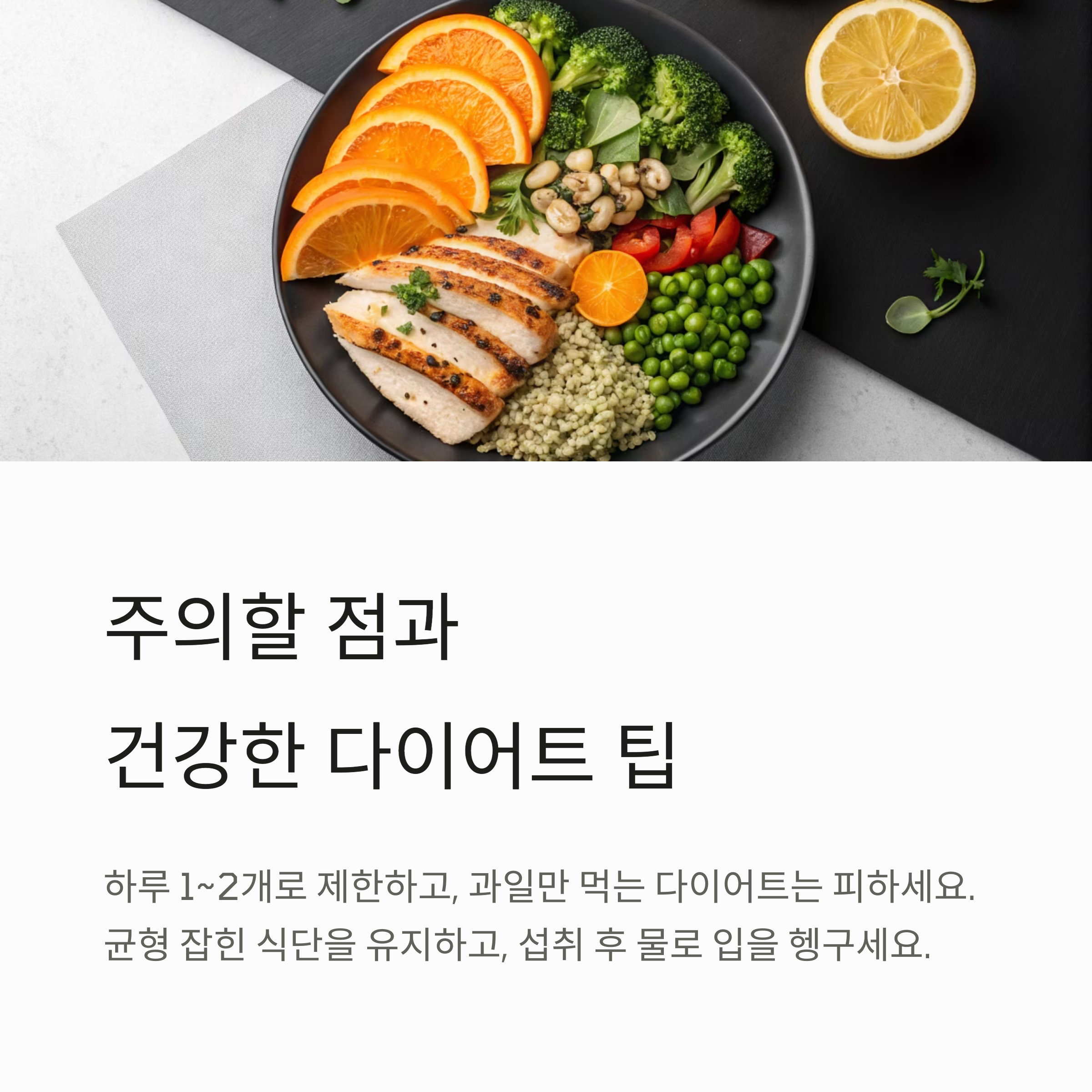 - 과일만 먹는 다이어트는 영양 불균형 위험 → 균형 잡힌 식단 유지