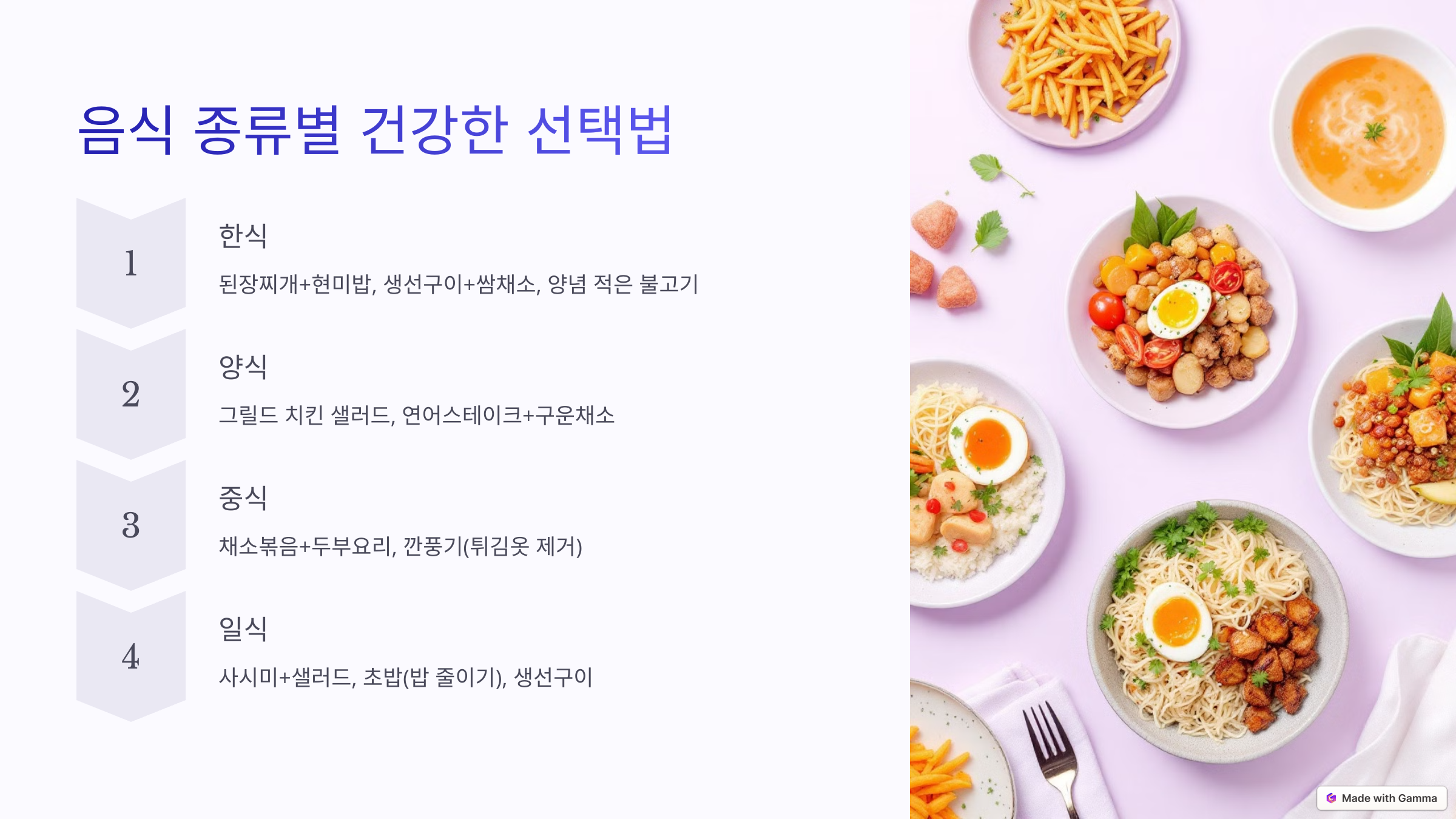 - 음식 종류별 건강한 선택법 (한식, 양식, 중식, 일식 등)