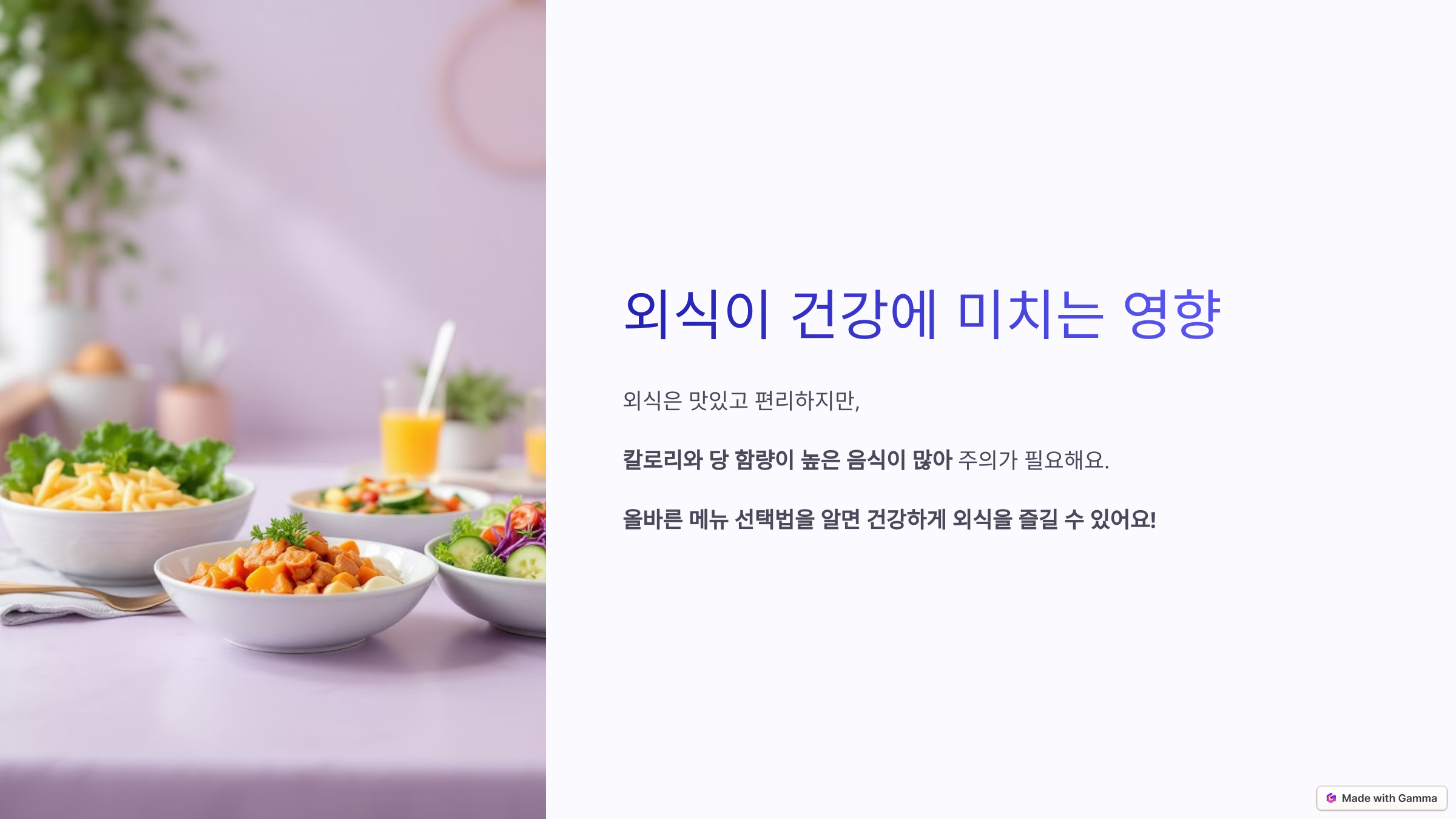 외식은 맛있고 편리하지만, 칼로리와 당 함량이 높은 음식이 많아 주의가 필요해요.