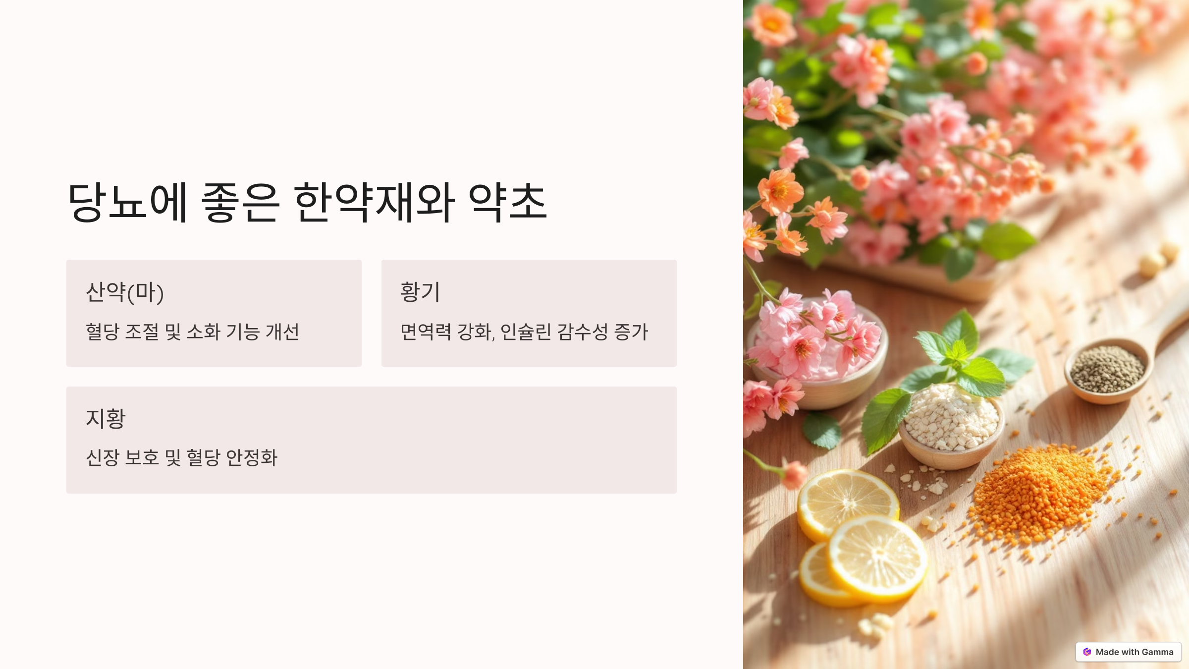 한약재 중에는 혈당을 낮추고, 인슐린 기능을 개선하는 효과가 있는 것들이 있습니다.