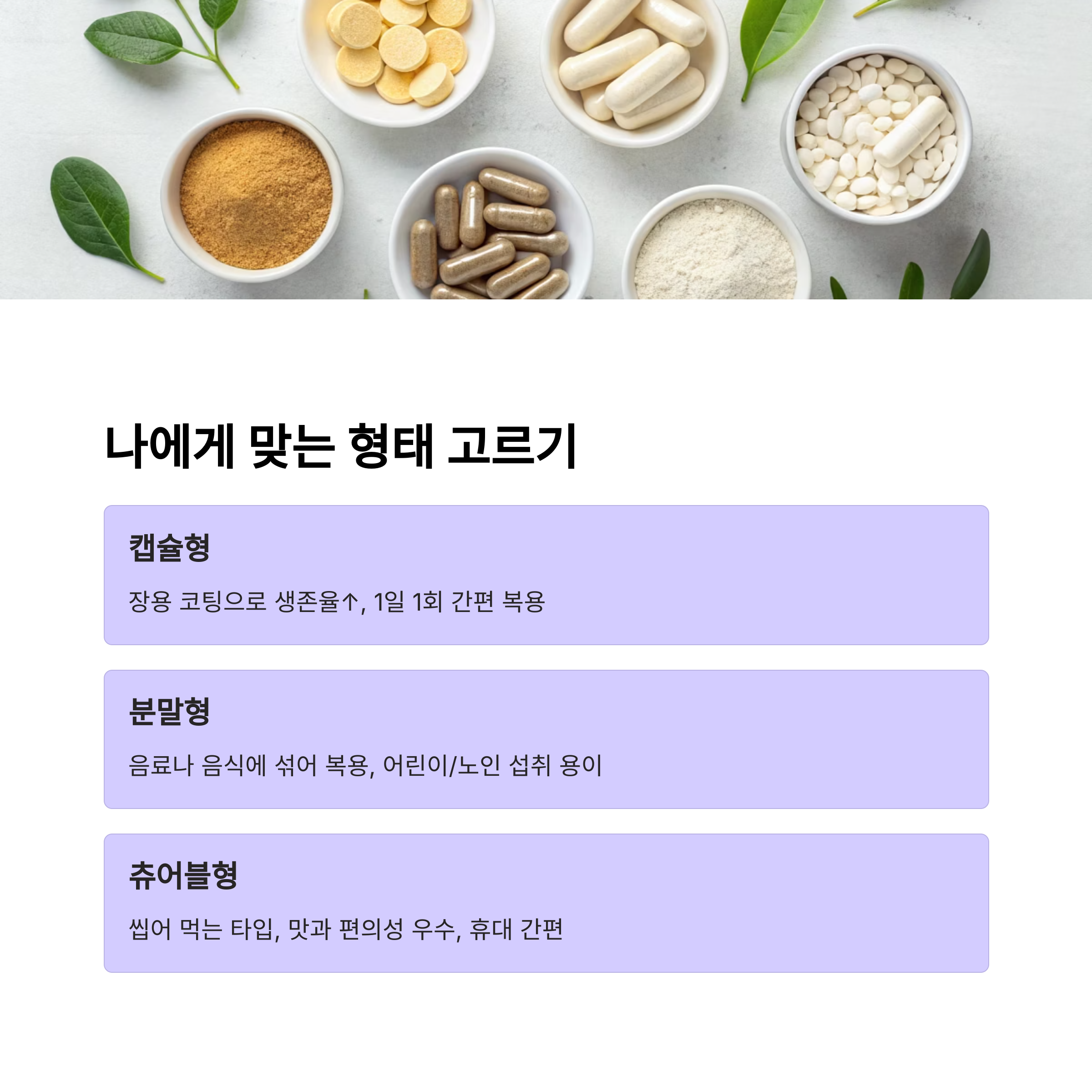 개인의 생활패턴과 선호에 따라 골라야 꾸준히 복용할 수 있어요.