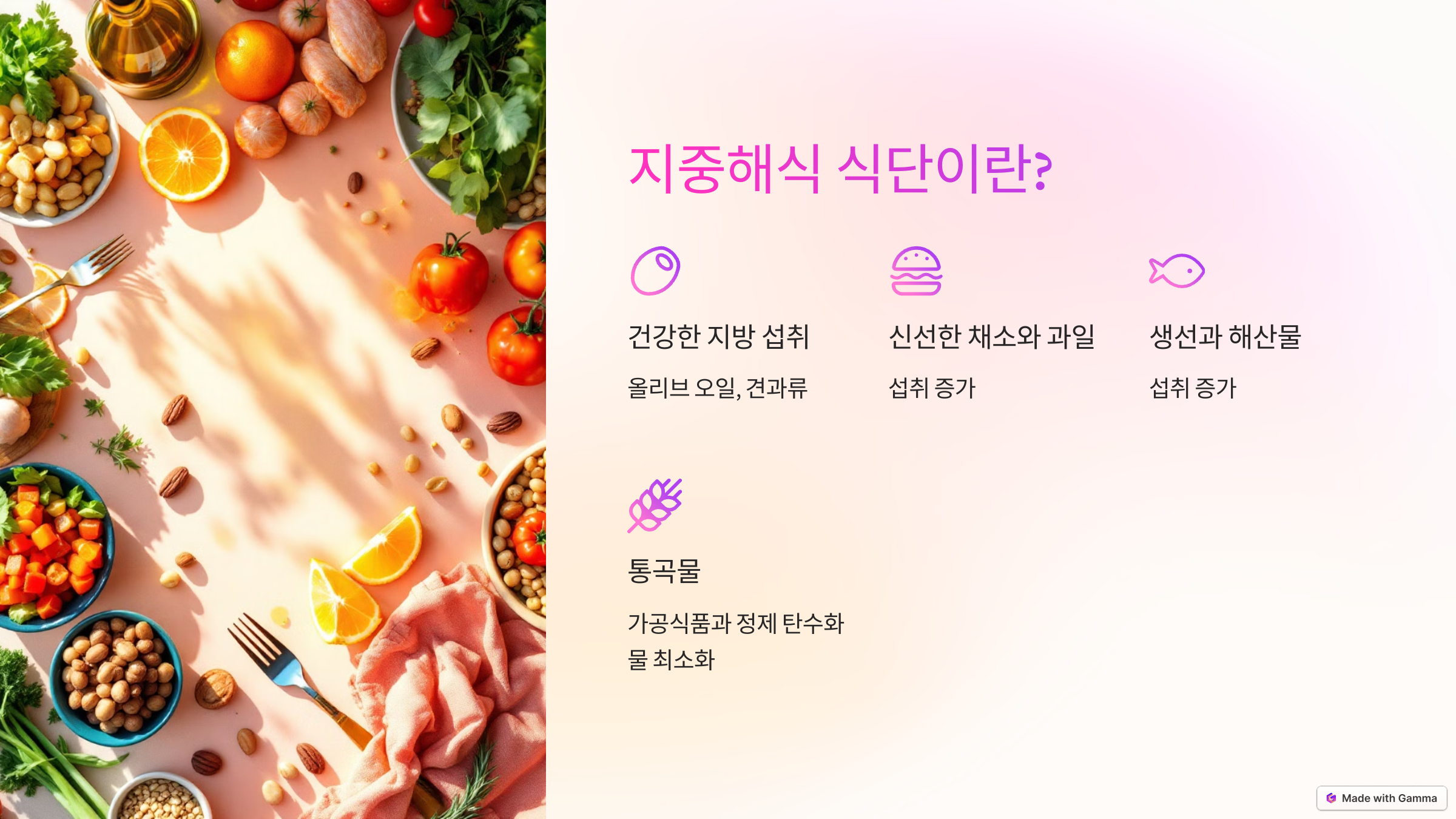 지중해식 식단은 신선한 채소, 과일, 건강한 지방(올리브 오일), 생선, 통곡물을 중심으로 한 식단입니다.