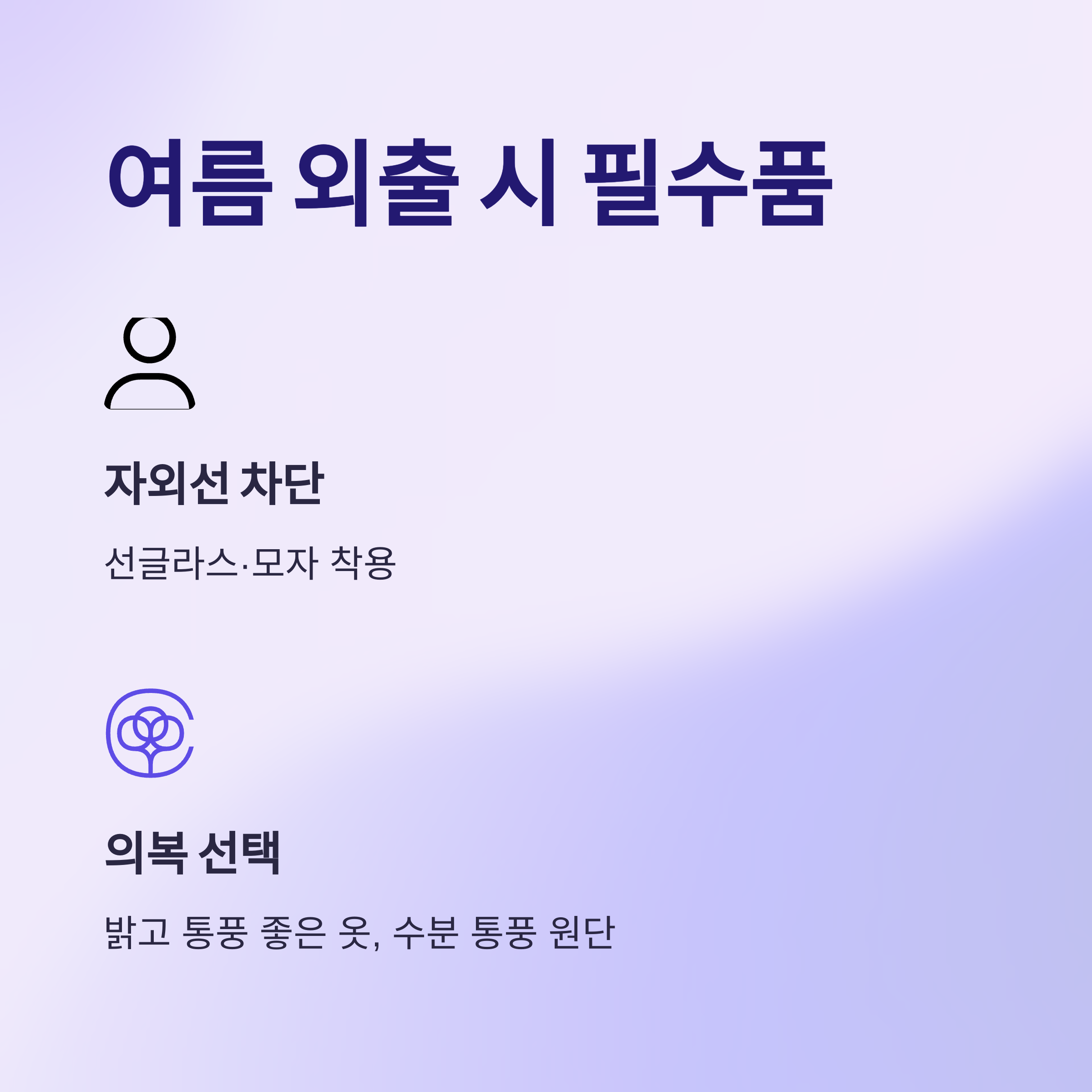 - 자외선 차단제·선글라스·모자 착용 - 밝고 통풍 좋은 옷, 수분 통풍 원단 권장