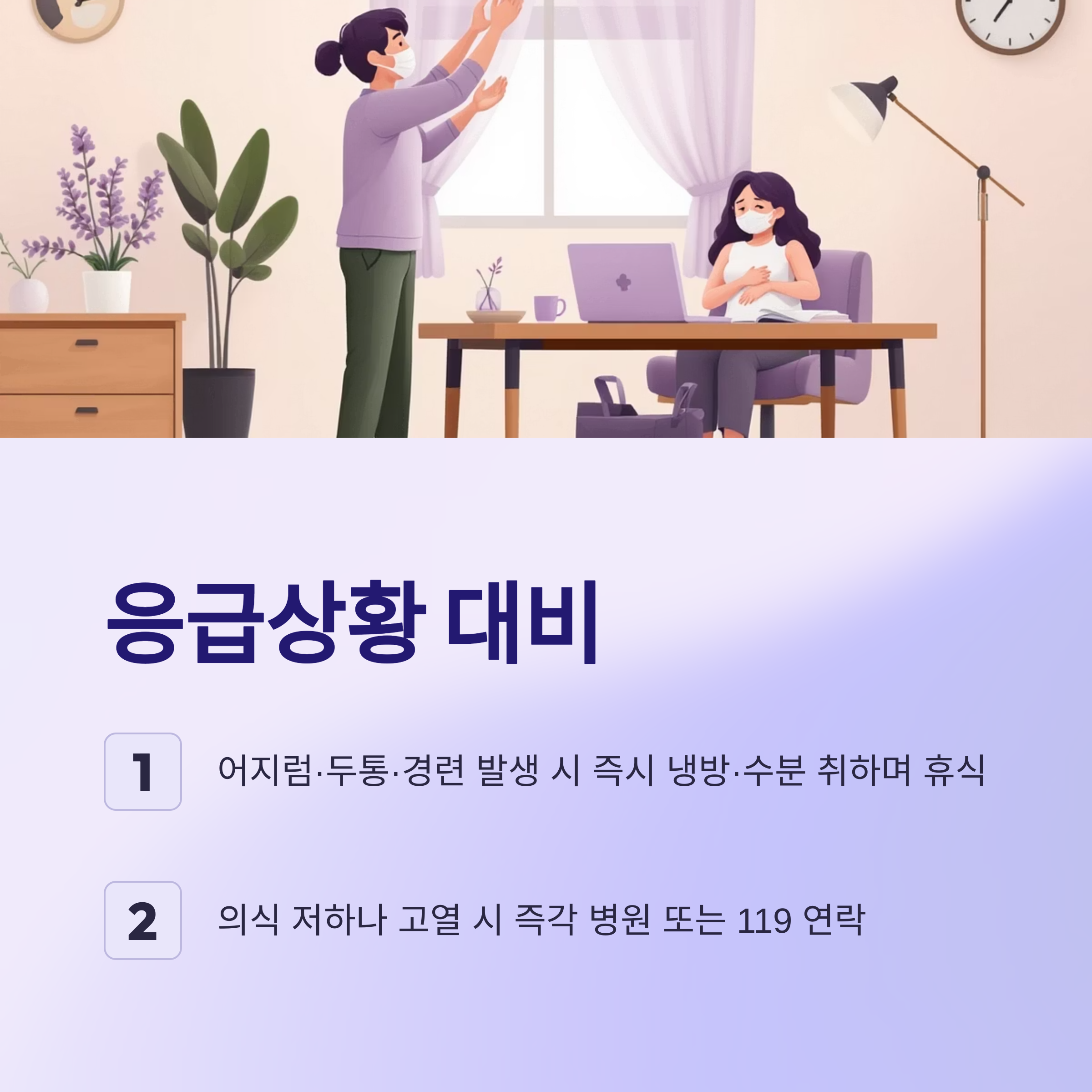 - 어지럼·두통·경련 발생 시 즉시 냉방·수분 취하며 휴식 - 의식 저하나 고열 시 즉각 병원 or 119 연락