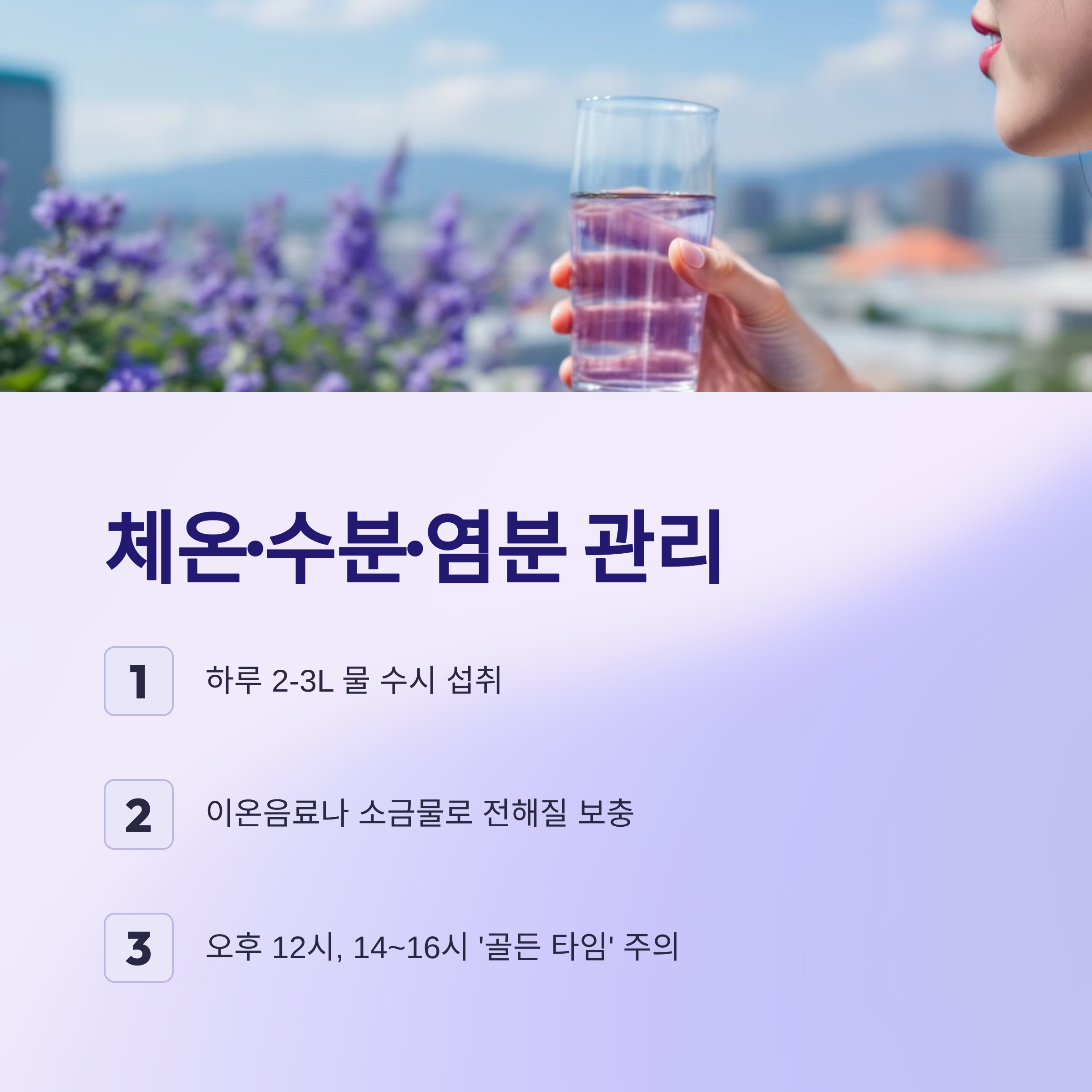 - 하루 2~3L 물 수시 섭취 - 이온음료나 소금물로 전해질 보충 - 오후 36~12시, 14~16시 ‘골든 타임’ 주의