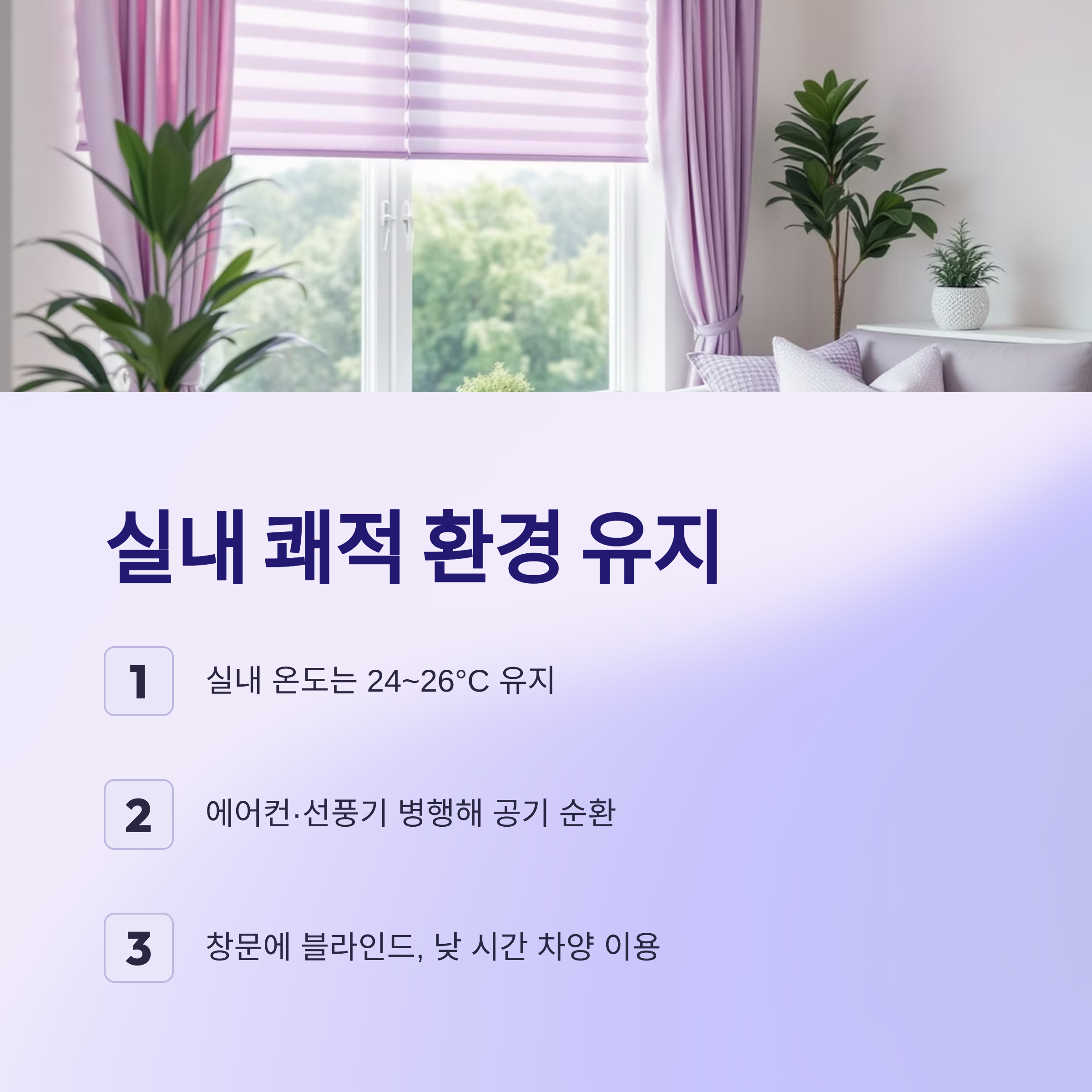- 실내 온도는 24~26°C 유지 - 에어컨·선풍기를 병행해 공기 순환 - 창문에는 블라인드, 낮 시간 차양 이용
