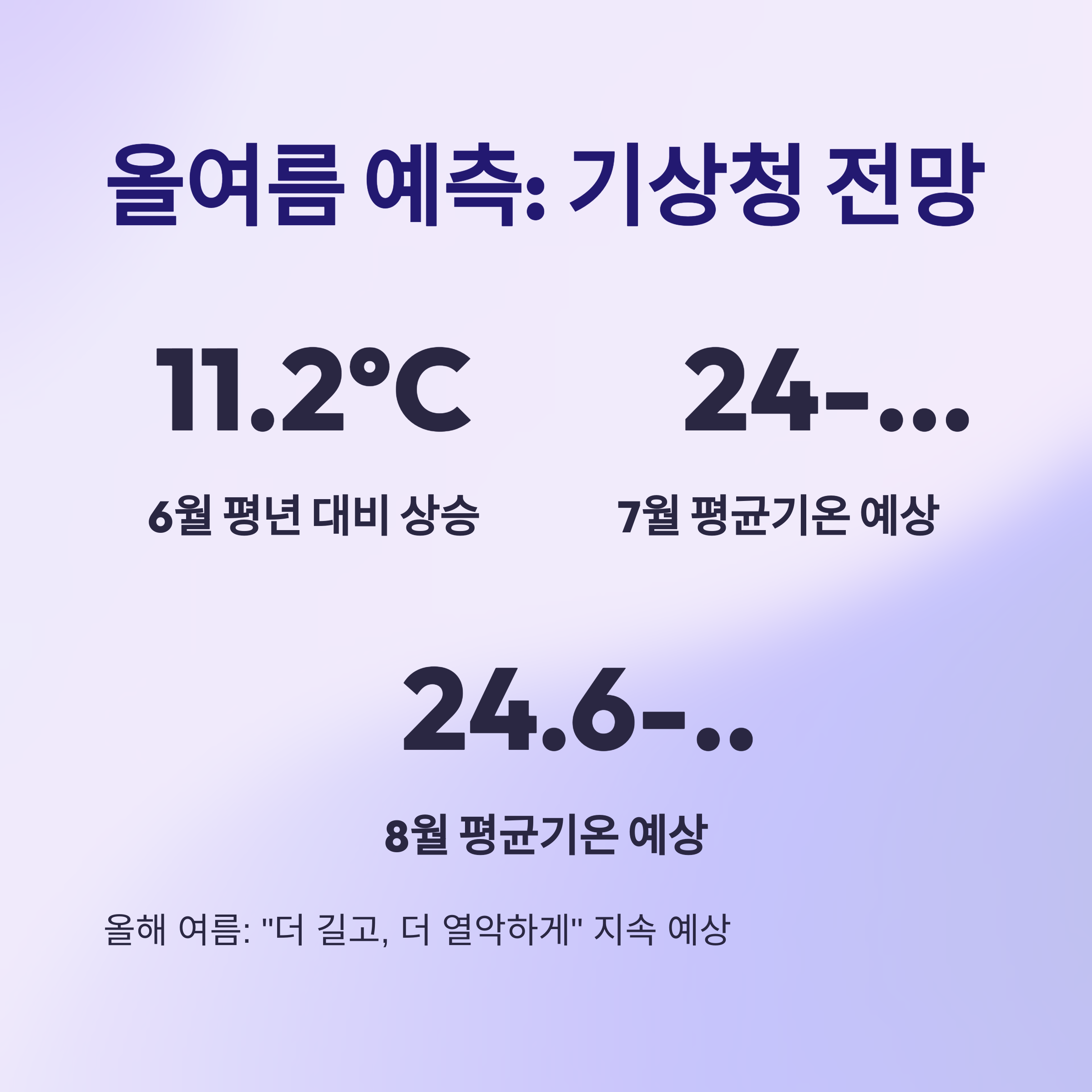 기상청의 전망에 따르면 6월은 평년보다 1~1.2°C 높았고, 7~8월 역시 40% 이상 확률로 평년 대비 높은 기온 분포가 예상됩니다. 특히 7·8월 평균기온은 각각 24~25°C, 24.6~25.6°C 구간에 위치할 것으로 예측됩니다