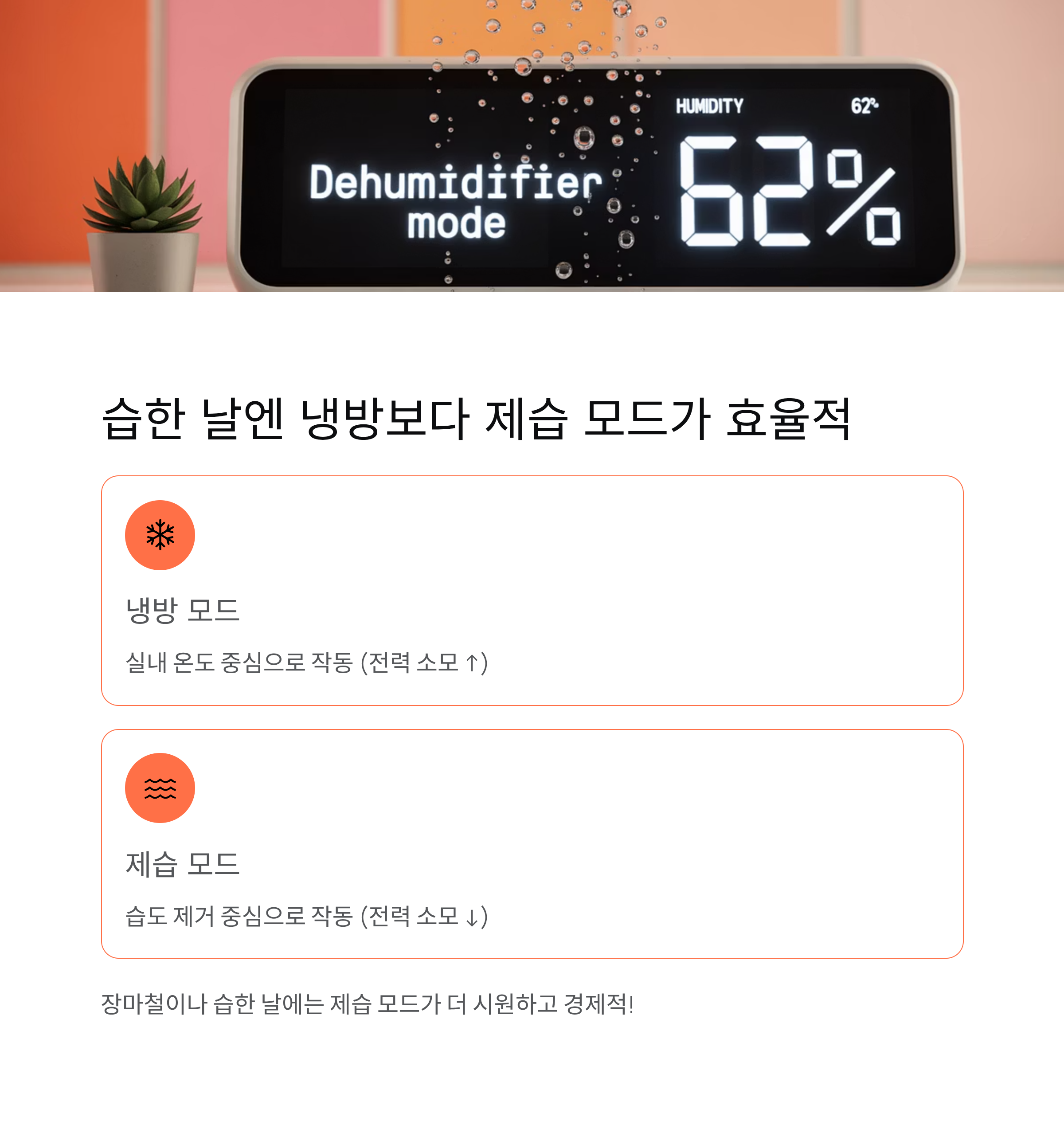 특히 장마철이나 습한 여름날에는 제습 모드가 전기세 절약에 더 유리합니다.