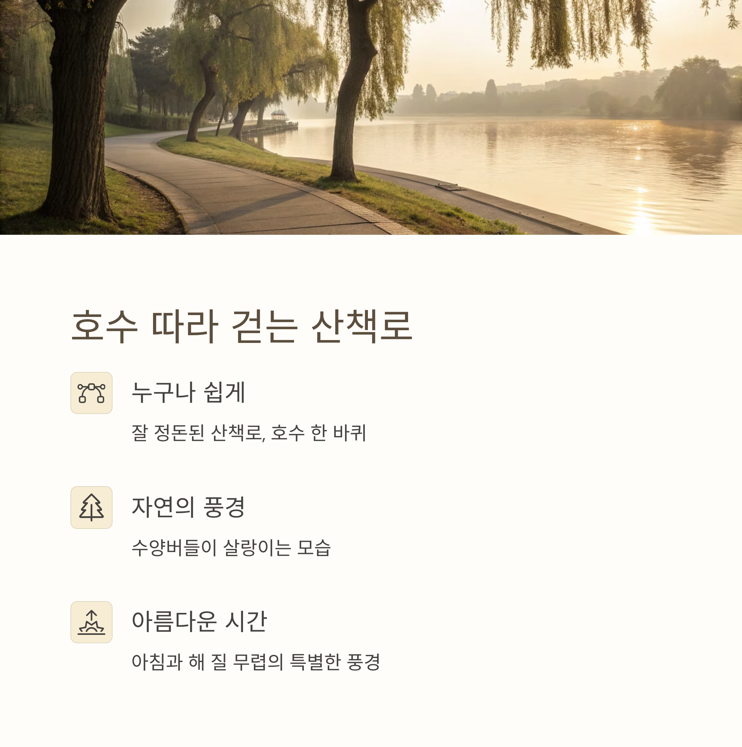 호수를 따라 걷는 산책로, 자연이 주는 편안함