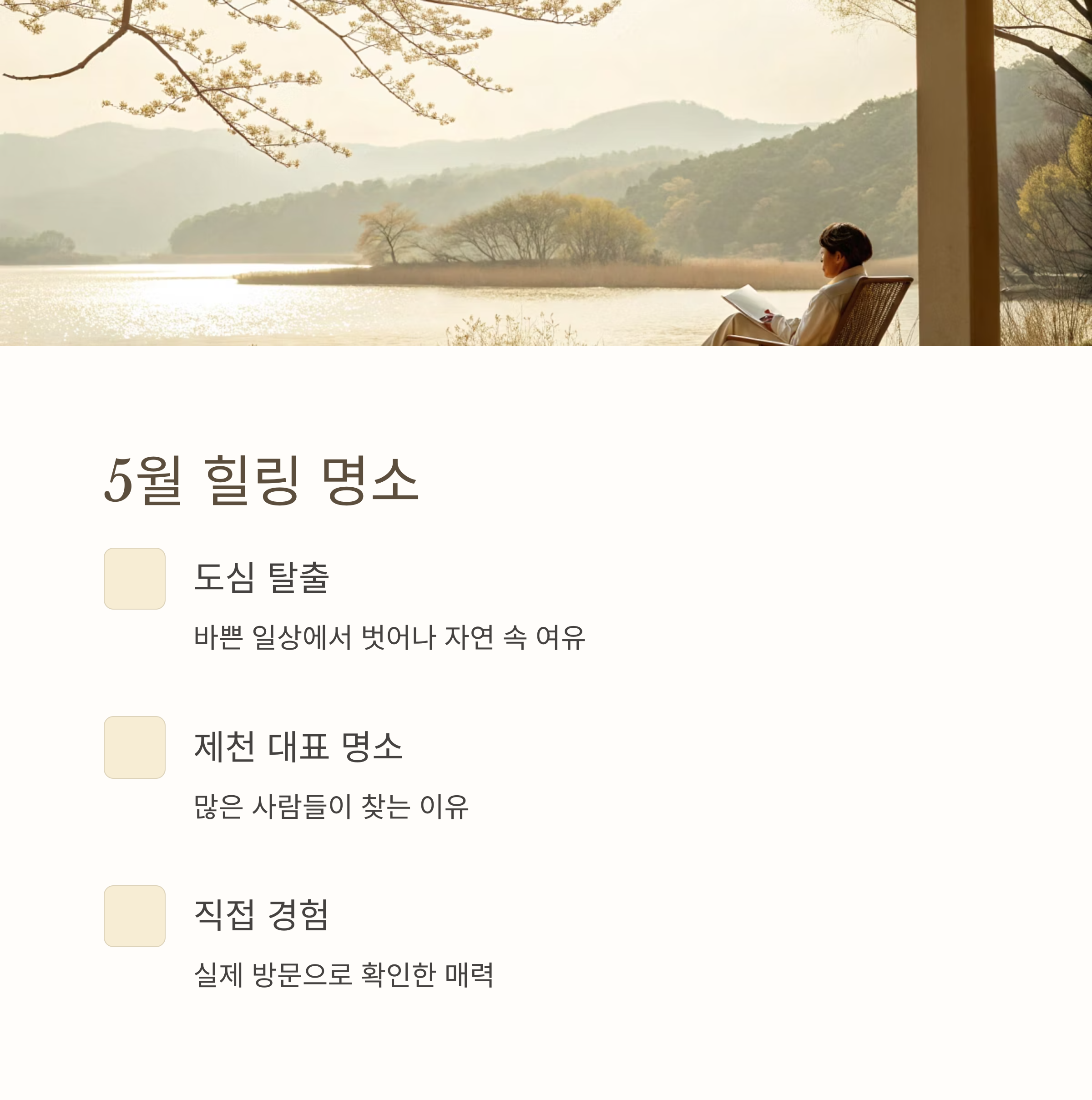 이번 여행을 통해 자연 속에서 온전한 쉼을 경험할 수 있었으며, 도심 속 일상에서 벗어나 여유를 찾고 싶은 분들께 적극 추천하고 싶습니다.