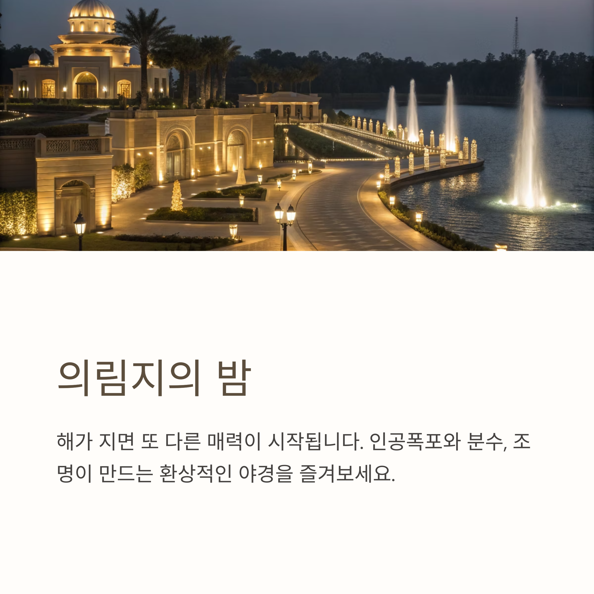 해가 지면 의림지는 또 다른 매력을 보여줍니다. 인공폭포와 분수에는 조명이 들어와 환상적인 분위기를 연출하고, 미디어파사드 영상도 상영되어 색다른 볼거리를 제공합니다.