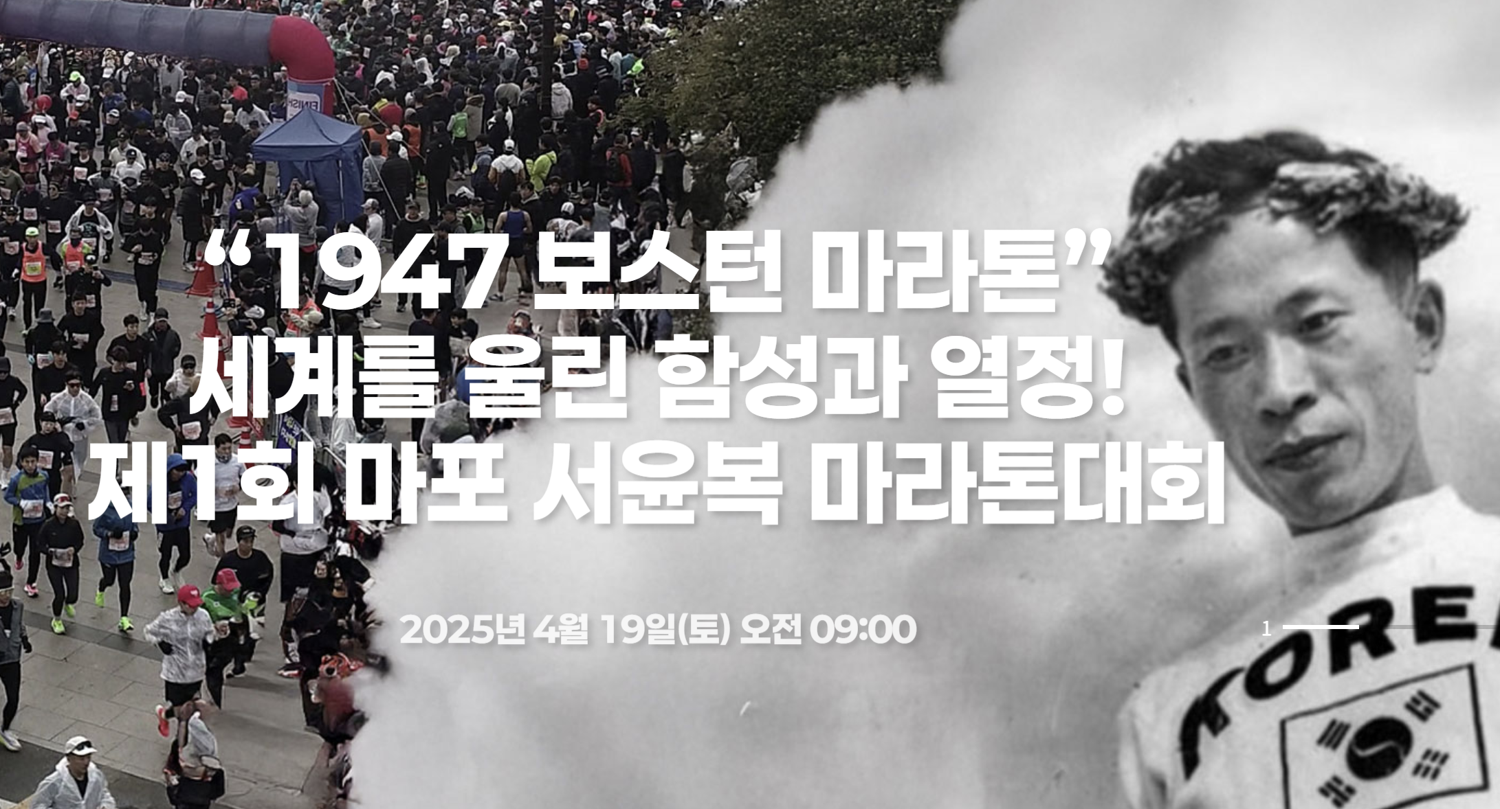 1947년 보스턴 마라톤 우승자이자 한국 마라톤의 전설 서윤복 선수를 기리는 제1회 마포 서윤복 마라톤대회가 2025년 4월 19일(토) 오전 9시, 상암 월드컵공원 평화광장에서 개최됩니다.