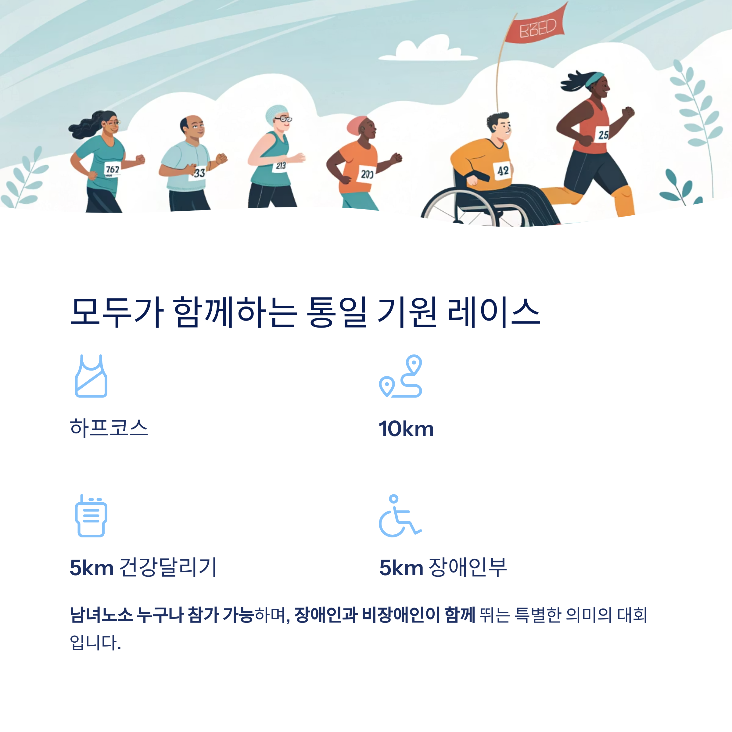 5km 장애인부가 별도로 운영되며, 보조자 동반 참여도 가능합니다. 통일과 포용의 의미를 담은 상징적인 코스로 운영됩니다.