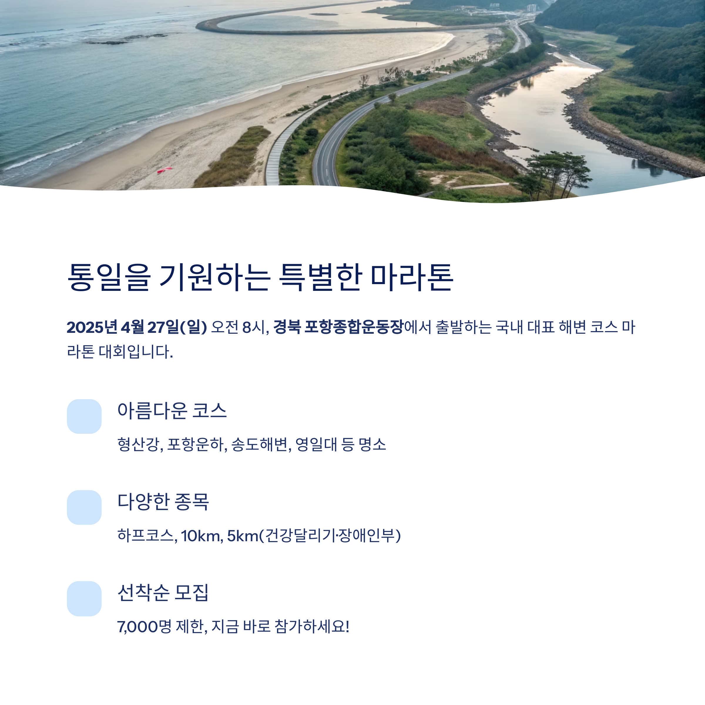 제23회 통일기원포항해변마라톤은 2025년 4월 27일(일) 오전 8시에 경북 포항종합운동장에서 출발하는 국내 대표 해변 코스 마라톤 대회입니다.