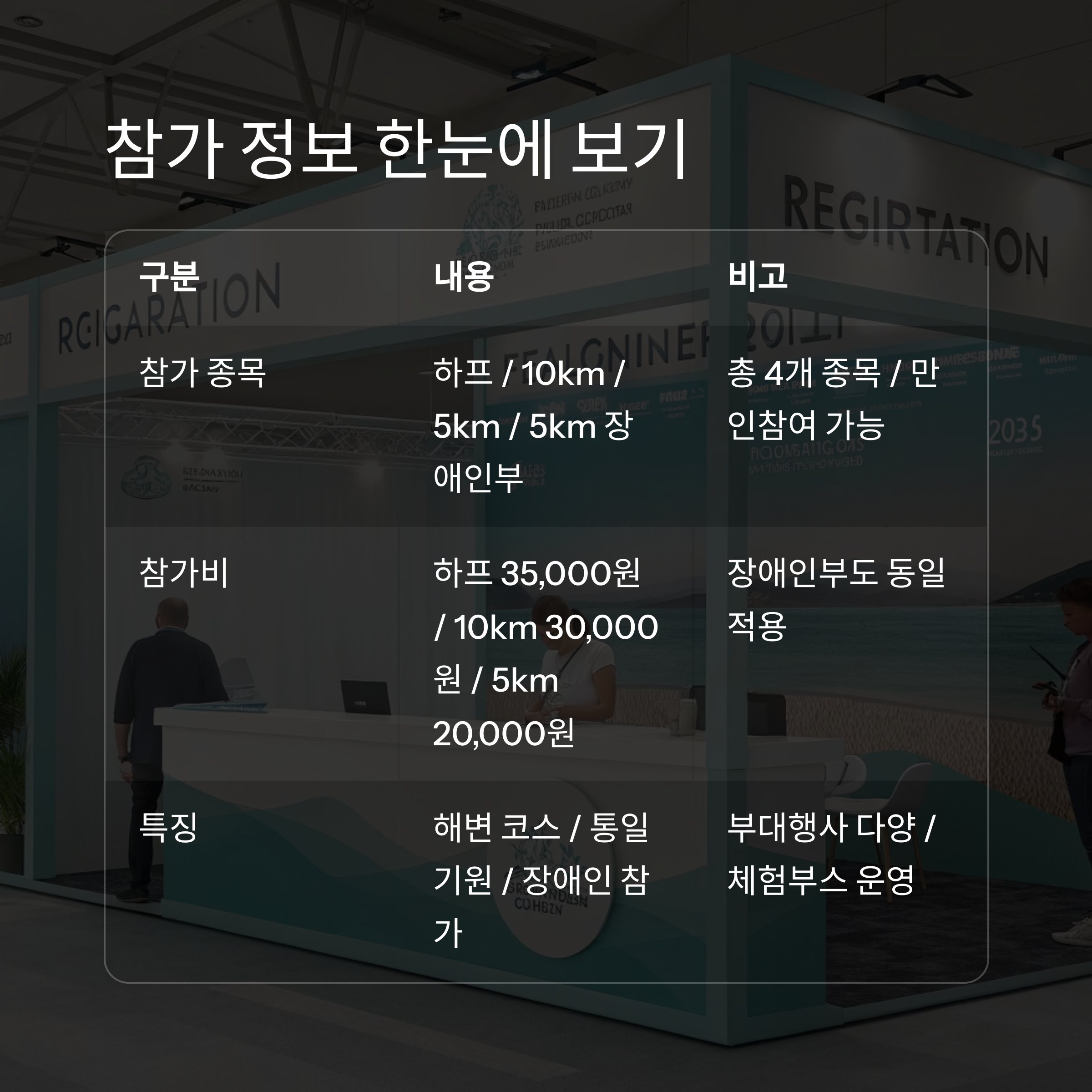 | 참가비 | 하프 35,000원 / 10km 30,000원 / 5km 20,000원 | 장애인부도 동일 적용 |