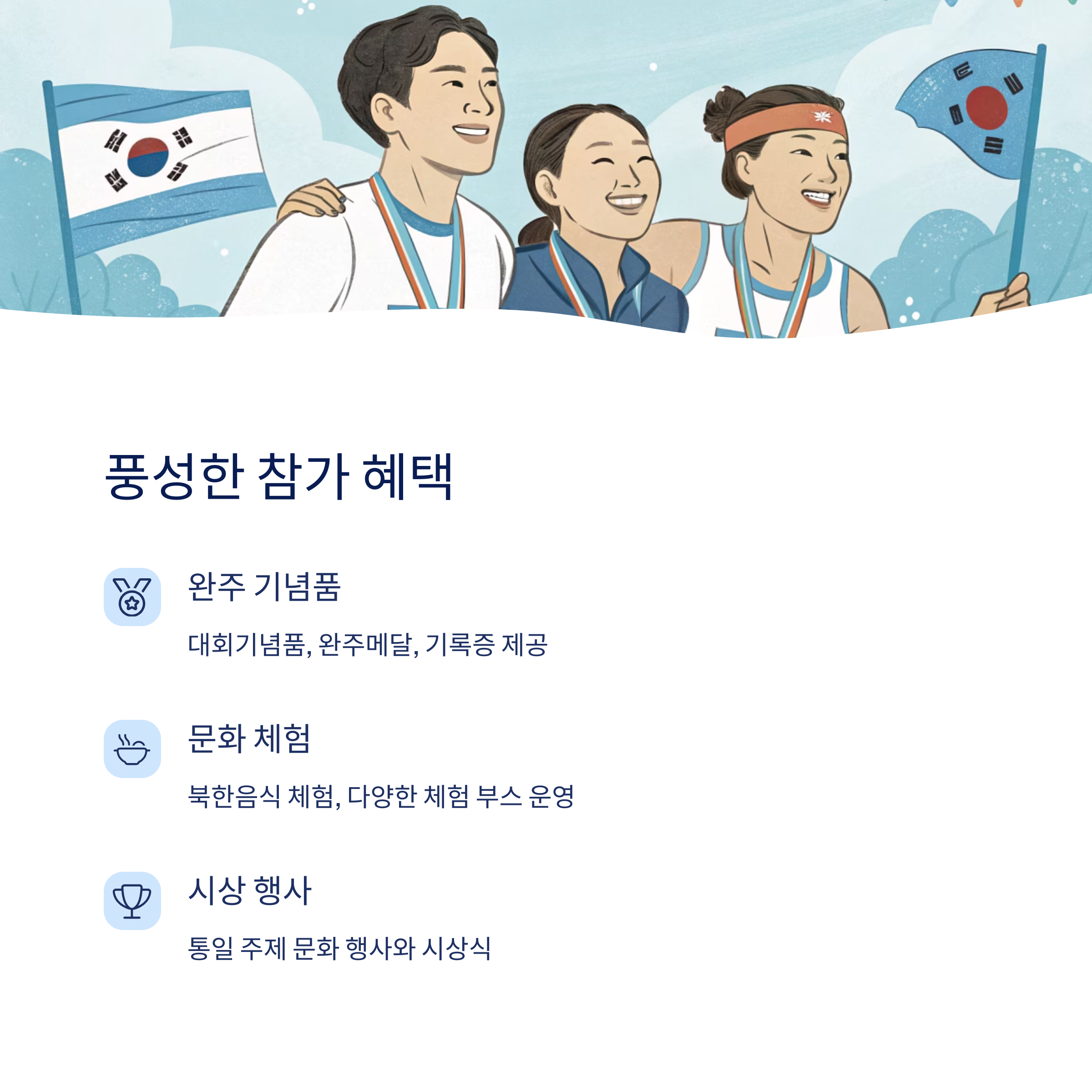 참가자에게는 대회기념품, 완주메달, 기록증이 제공되며, 다양한 체험 부스와 북한음식 체험 등 통일을 주제로 한 문화 행사와 시상이 함께 진행됩니다. 기록 조회는 대회 후 공식 홈페이지에서 확인할 수 있습니다.