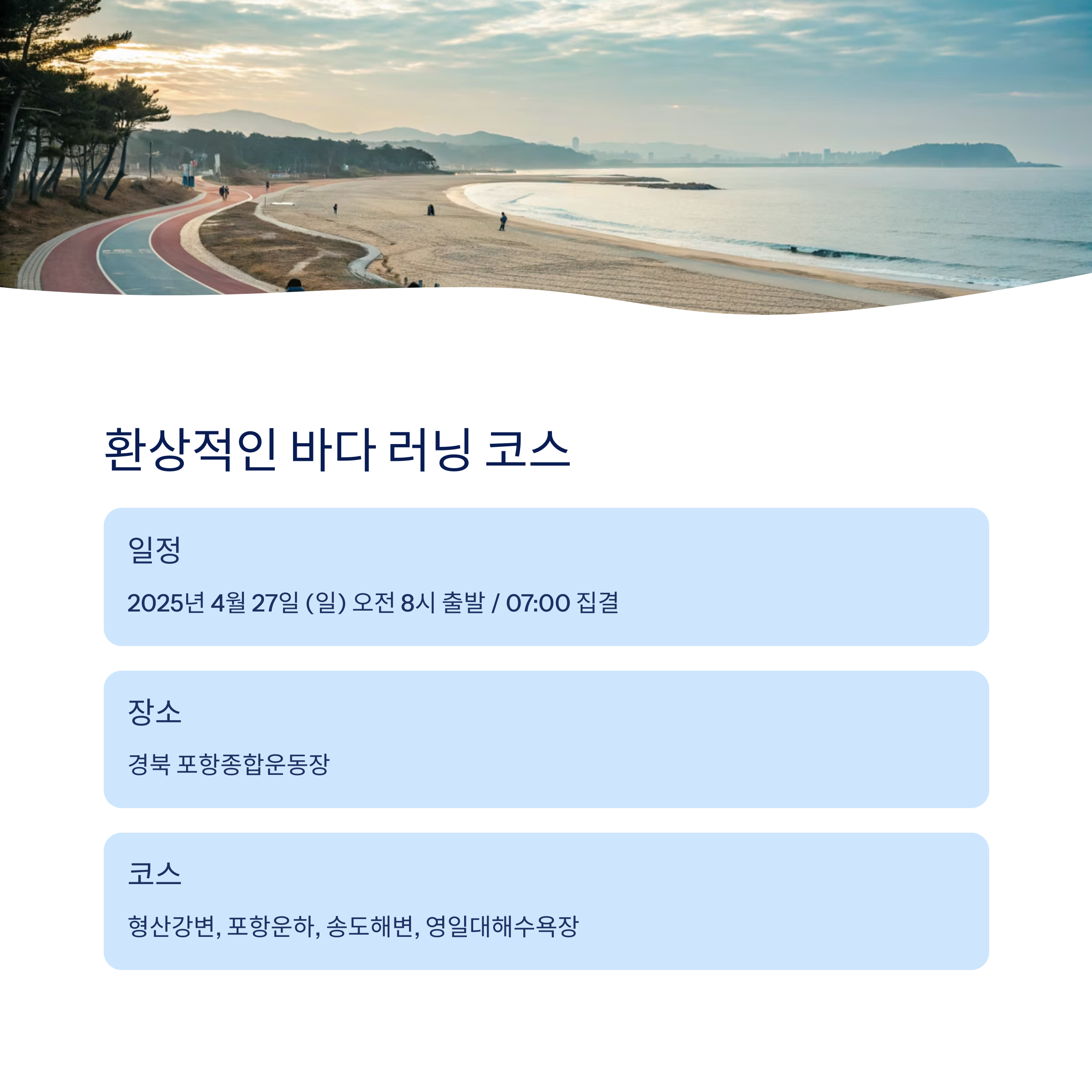 포항의 아름다운 형산강, 포항운하, 송도해변, 영일대 등 명소를 따라 달리는 본 대회는 하프코스, 10km, 5km(건강달리기·장애인부) 4개 종목으로 진행되며, 7,000명 선착순 참가자를 모집합니다.