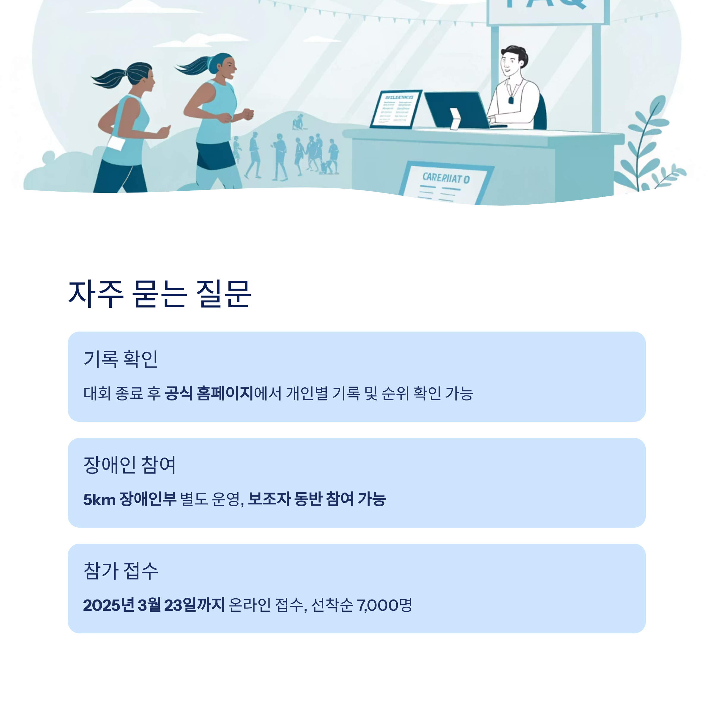 | 참가 종목 | 하프 / 10km / 5km / 5km 장애인부 | 총 4개 종목 / 만인참여 가능 |