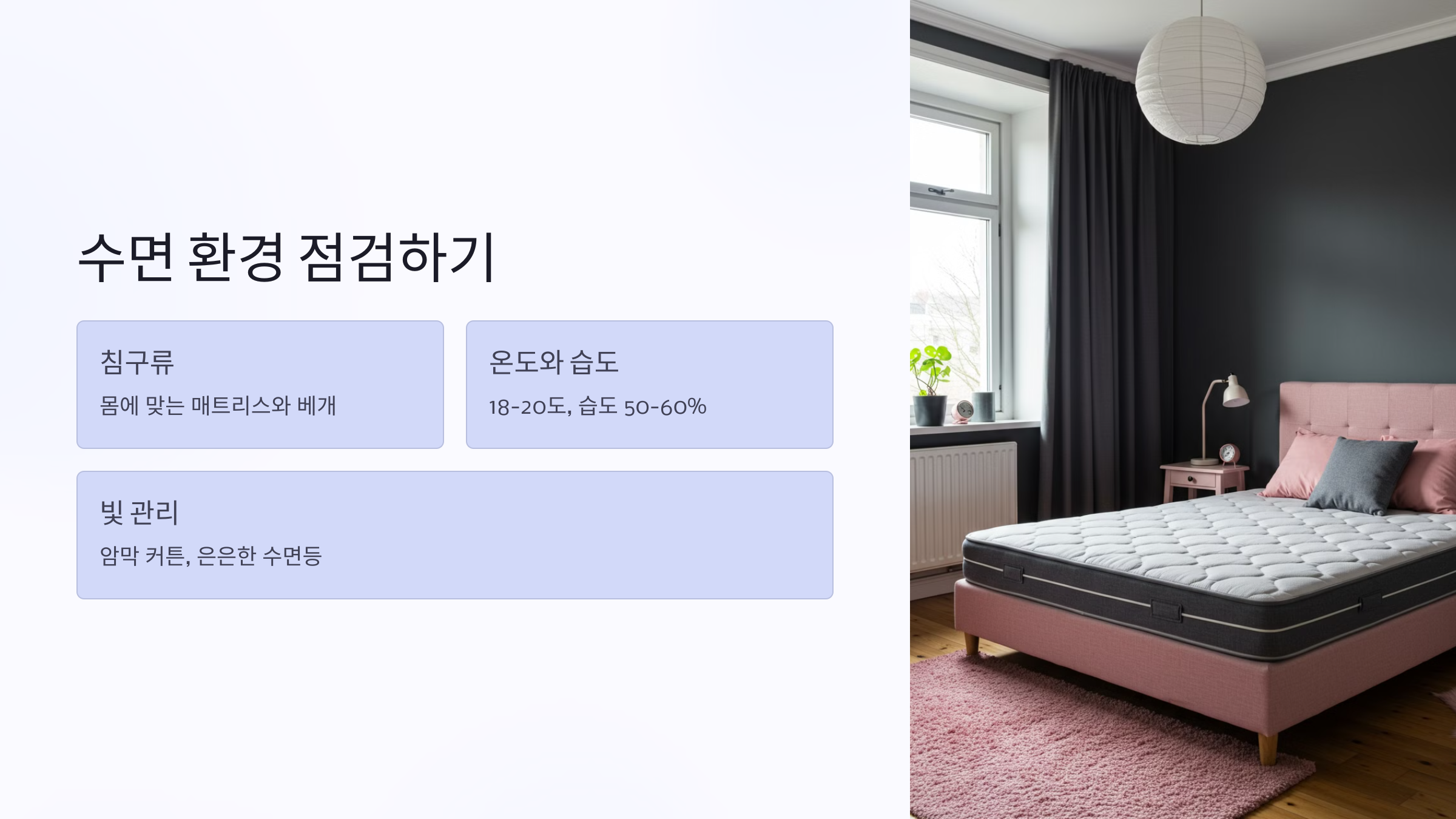 수면 환경도 아주 중요합니다. 매트리스와 베개가 내 몸에 맞는지, 이불은 너무 덥거나 차갑지 않은지 한 번 점검해보세요.