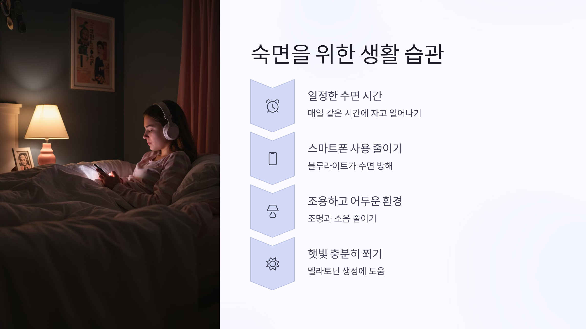 1. 일정한 수면 시간 유지하기 – 매일 같은 시간에 자고 일어나는 습관은 생체 리듬을 안정시켜 줍니다. 2. 잠들기 전 스마트폰 사용 줄이기 – 블루라이트가 뇌를 자극해 잠을 방해합니다. 3. 저녁 시간에는 조용하고 어두운 분위기 만들기 – 조명과 소음을 줄여 수면 유도 환경을 조성하세요. 4. 낮에는 햇빛을 충분히 쬐기 – 낮에 자연광을 받으면 멜라토닌 생성에 도움이 됩니다. 5. 가벼운 운동 – 격렬한 운동은 피하고, 저녁에 스트레칭이나 산책을 해보세요.