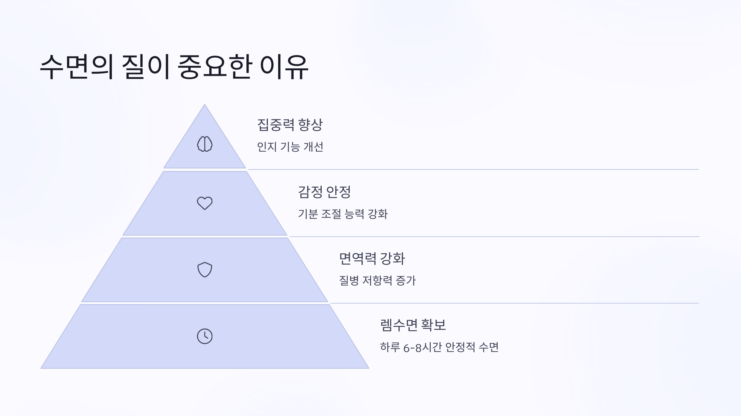 단순히 잠을 얼마나 오래 자느냐보다 얼마나 깊은 잠을 자느냐가 훨씬 중요합니다. 수면의 질이 떨어지면 하루 종일 피로가 쌓이고, 집중력 저하, 감정 기복까지 이어지기 쉬워요. 면역력도 약해져 잔병치레가 잦아지고, 장기적으로는 당뇨, 고혈압 등의 질환 위험도 높아집니다.