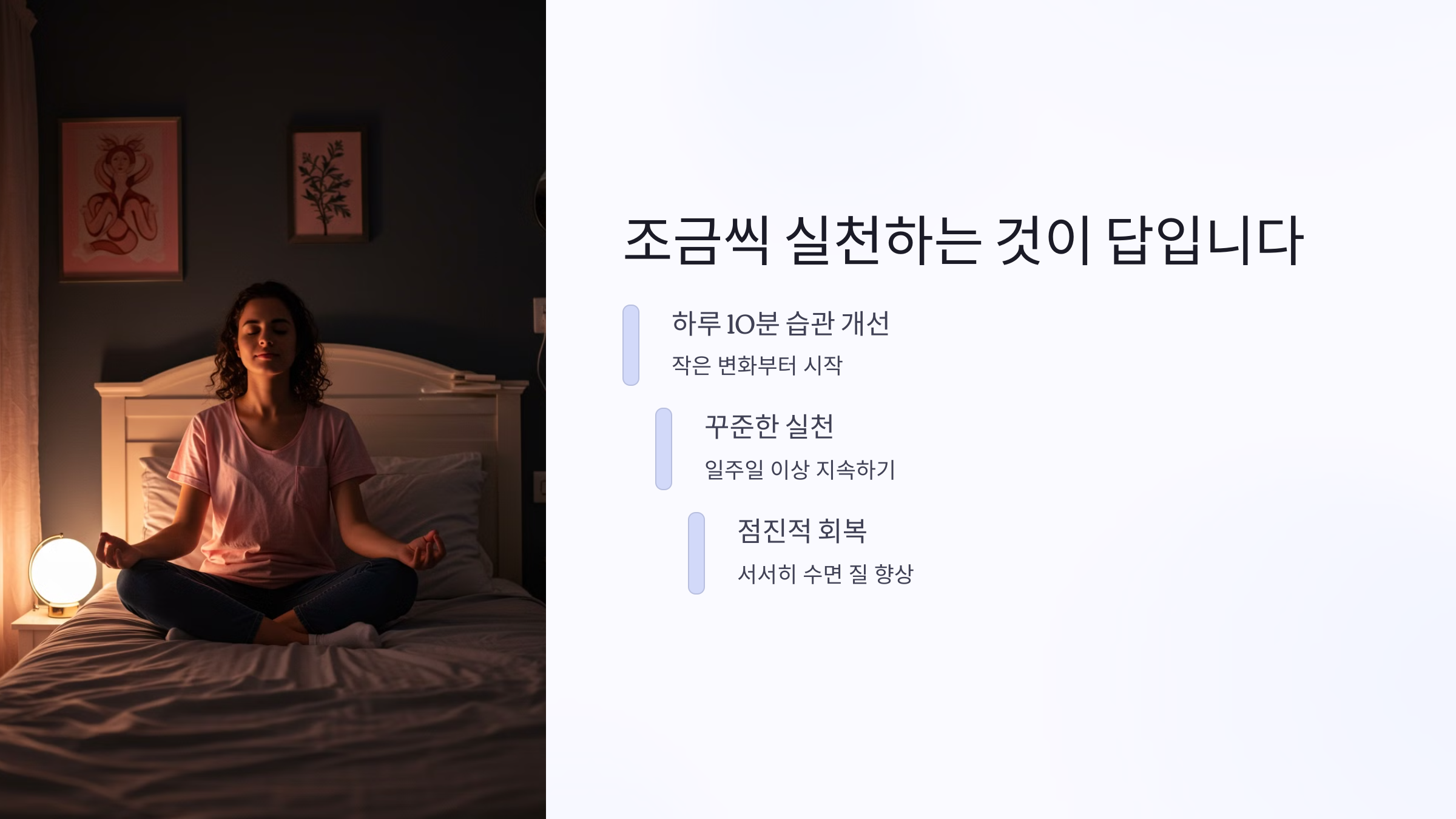 불면증은 하루아침에 사라지지 않습니다. 하지만 하루 10분씩이라도 수면 습관을 개선하려는 노력을 한다면 조금씩 회복되는 걸 느끼실 수 있을 거예요.