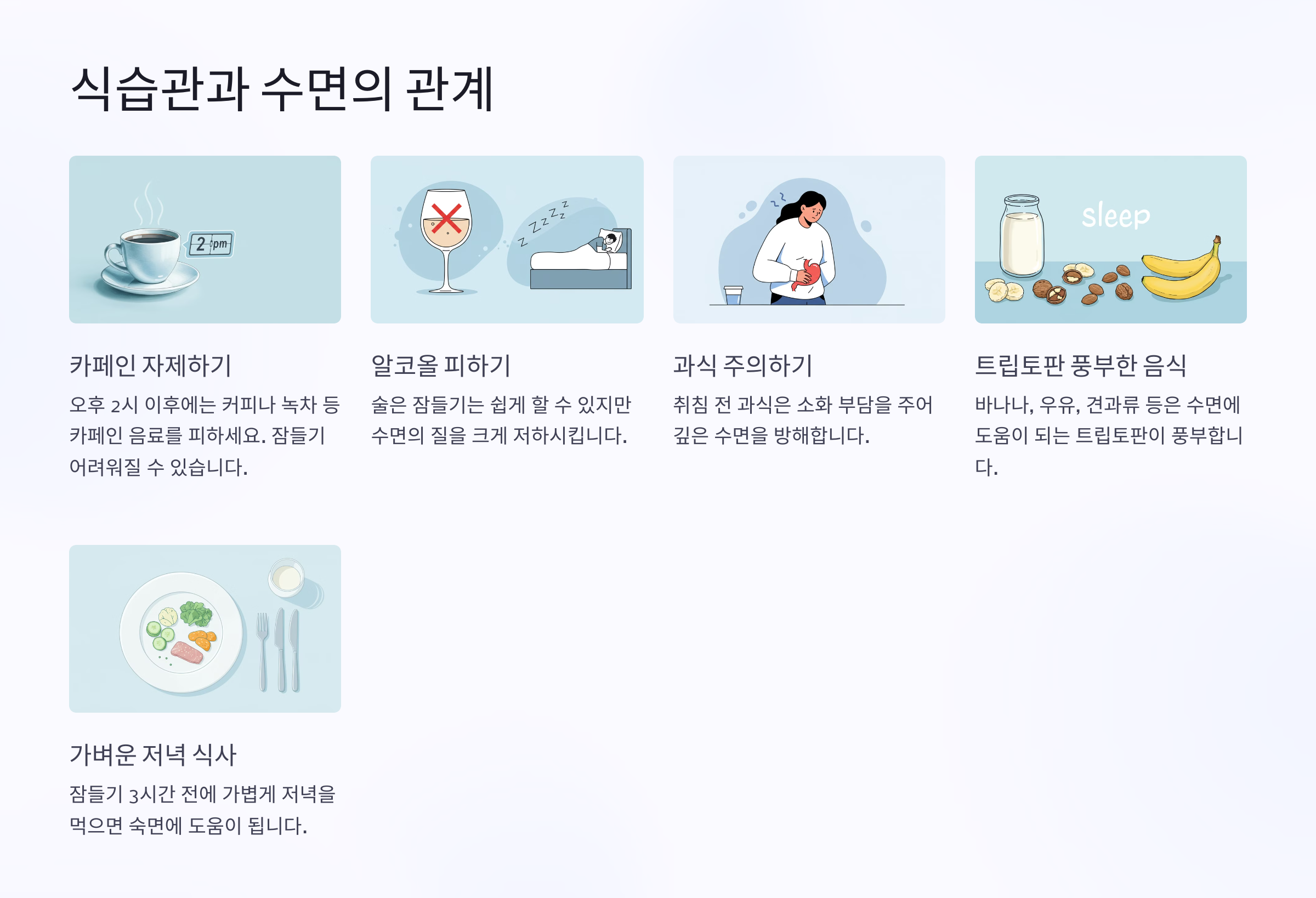 저녁 식사는 소화에 부담을 주지 않도록 가볍게 하며, 트립토판이 풍부한 음식(예: 바나나, 우유, 견과류 등)은 숙면을 유도하는 데 도움을 줍니다.