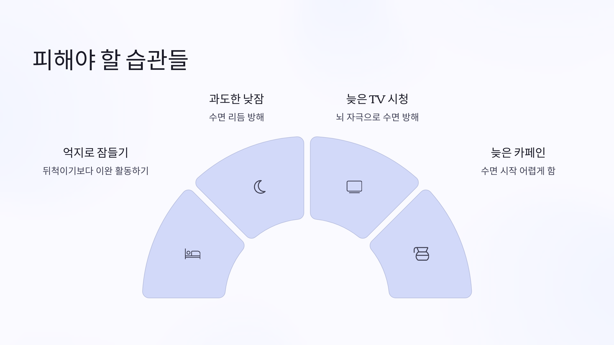 그리고 낮잠을 너무 자주 자거나, 저녁 늦게까지 TV를 보는 것도 수면 리듬을 깨뜨리는 행동이에요. 밤에는 몸과 뇌를 쉴 수 있도록 자극을 줄이는 것이 중요합니다.