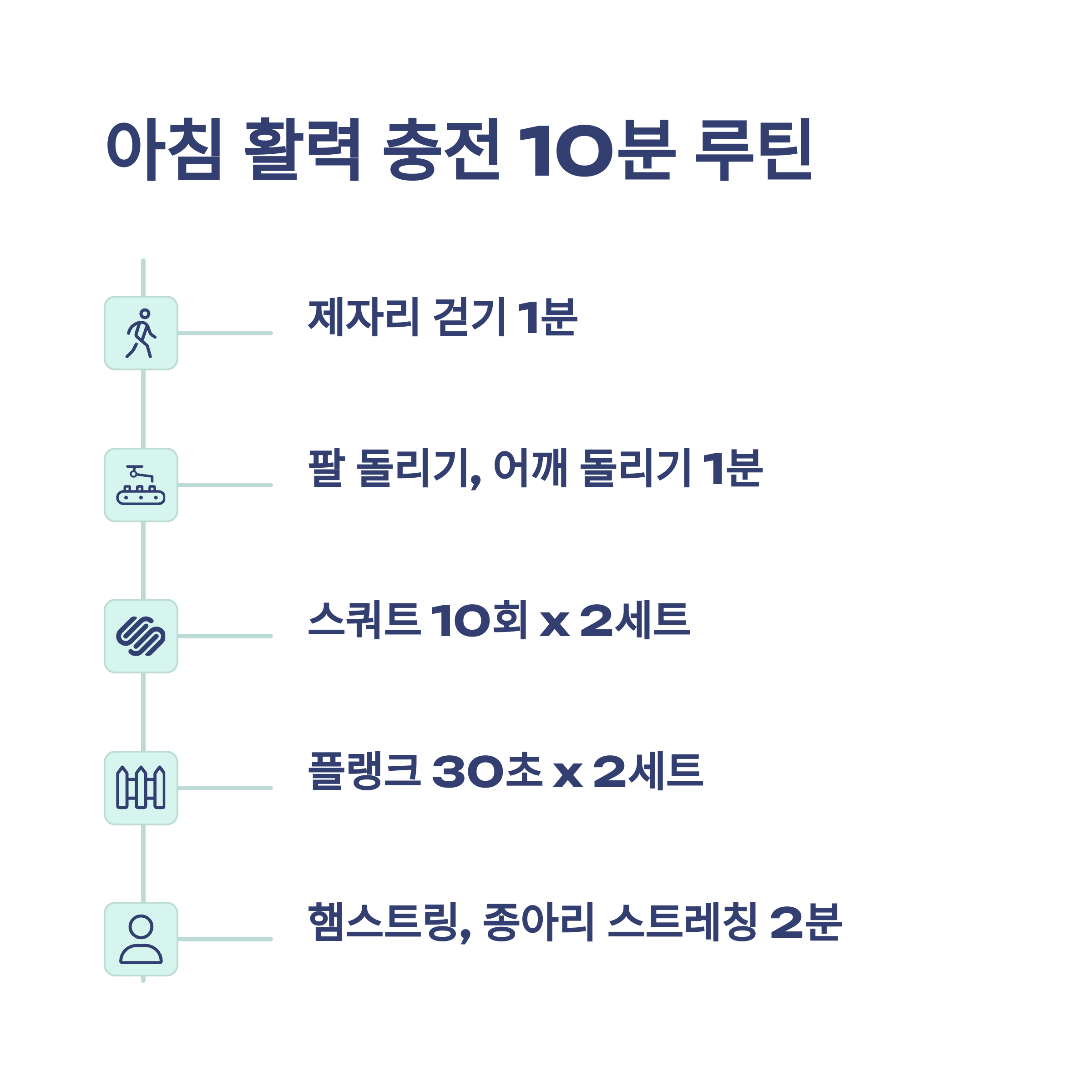 아침에는 몸을 깨우는 데 집중해야 합니다. 아래는 추천 루틴입니다.