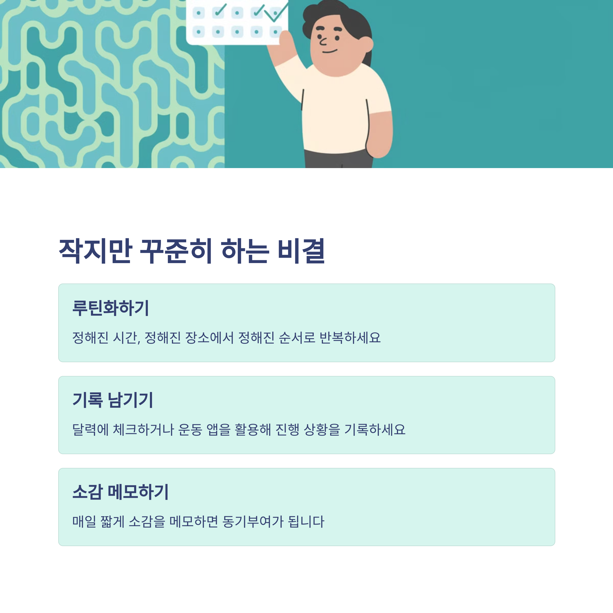 또한 기록을 남기는 것도 도움이 됩니다. 달력에 체크하거나 운동 앱을 활용해도 좋고, 매일 짧게 소감을 메모하는 것도 동기부여가 됩니다.