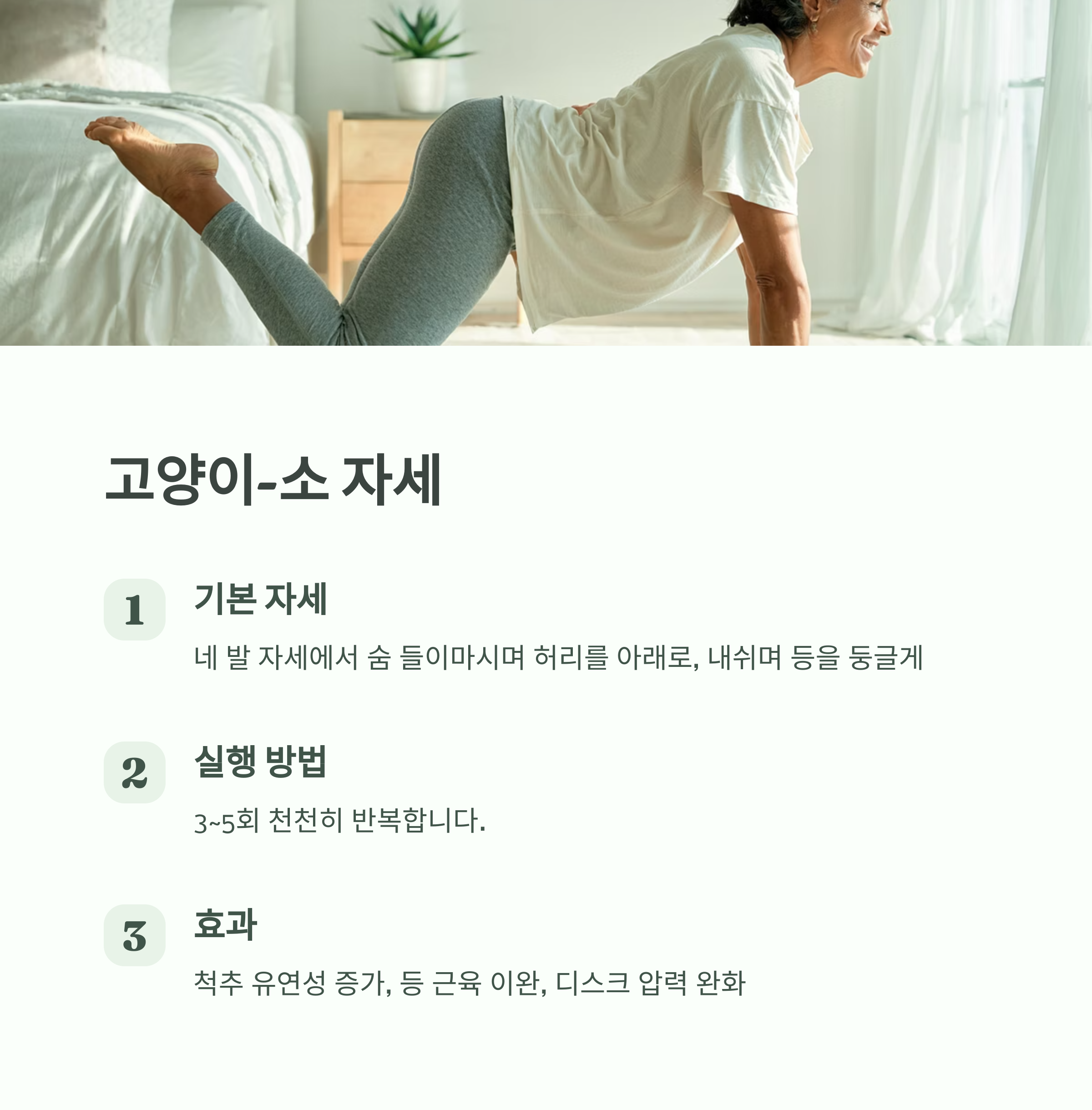 ✔ 이 동작은 척추 유연성과 긴장된 등 근육을 풀어주는 데 매우 효과적입니다. 척추 디스크 압력도 완화되므로 중년 허리 통증에 특히 추천돼요.