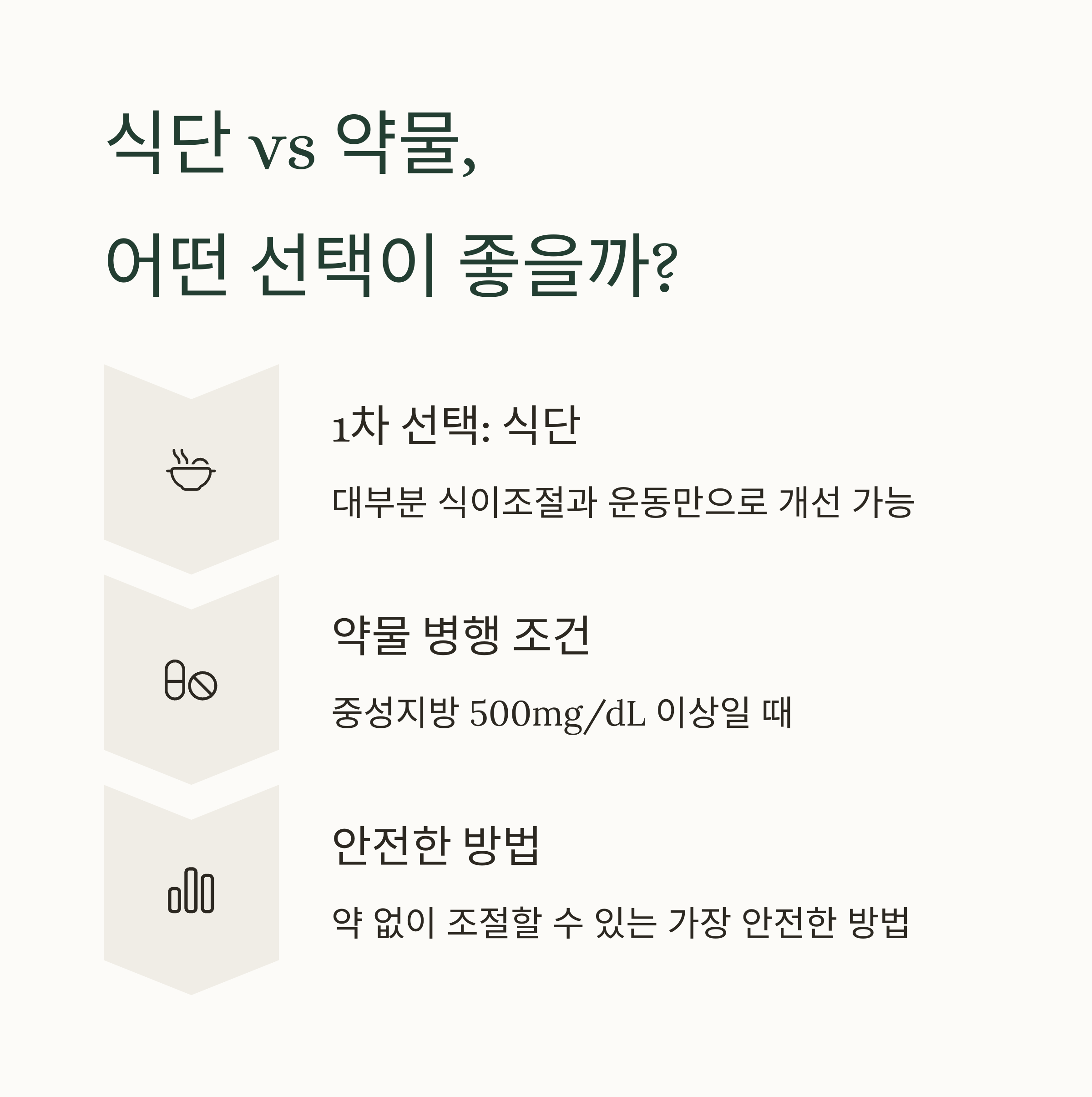 1차 선택은 식단입니다. 대부분의 중성지방 수치(150~499mg/dL)는 식이조절과 운동만으로도 충분히 개선 가능합니다. 특히 약 없이 조절할 수 있는 가장 안전한 방법이기도 합니다.