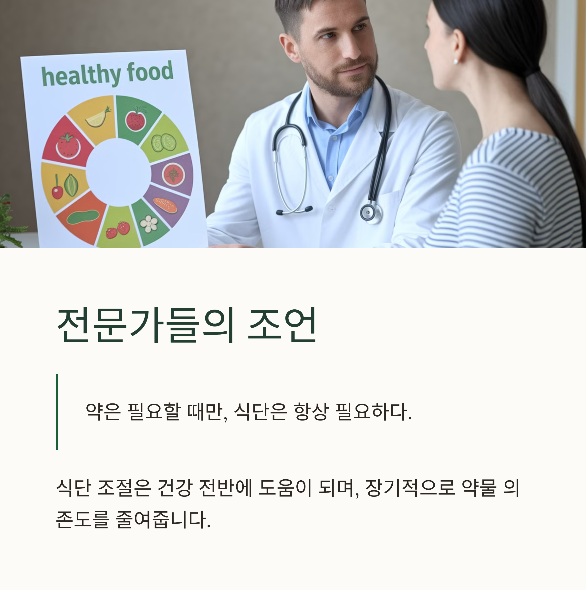 전문의들은 말합니다. "약은 필요할 때만, 식단은 항상 필요하다." 식단 조절은 건강 전반에 도움이 되며, 장기적으로 약물 의존도를 줄여줍니다.