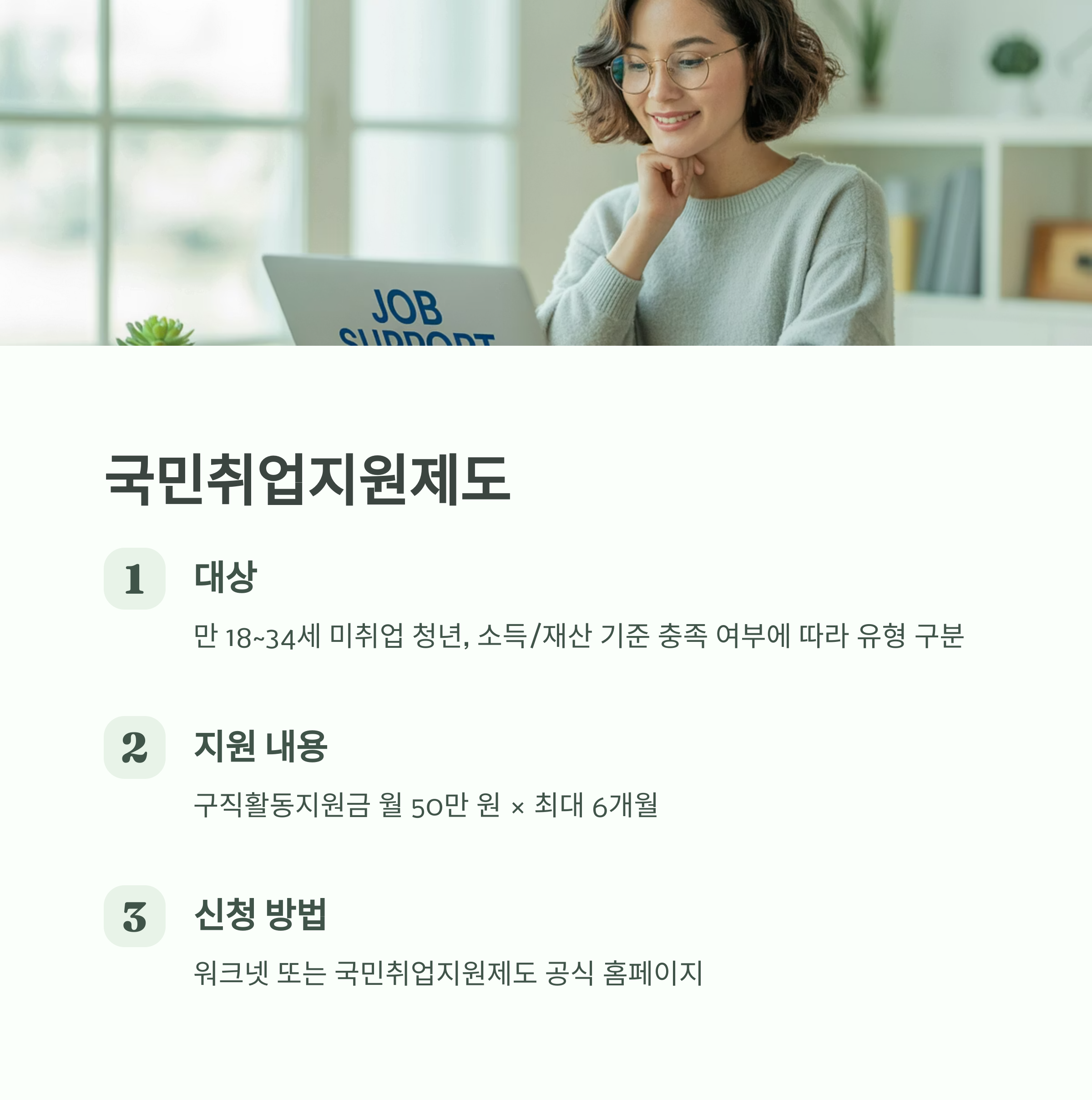 | 국민취업지원제도 | 미취업 + 소득기준 | 최대 월 50만 원 × 6개월 | 워크넷 / 국민취업지원제도 |