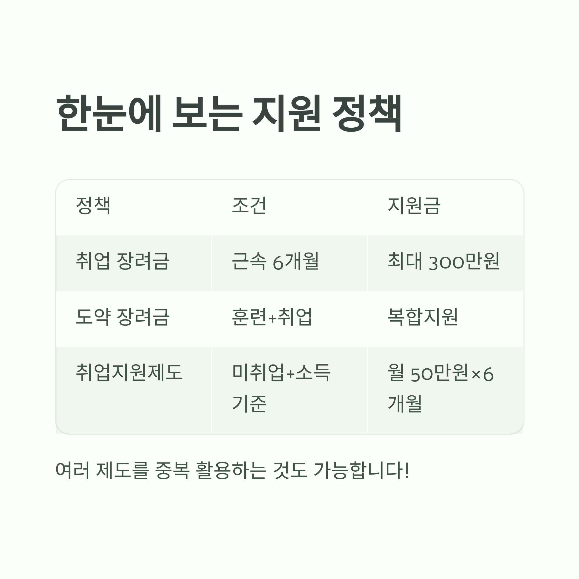 취업 준비 중이라면 여러 제도를 중복 활용하는 것도 가능합니다. (예: 국민취업지원제도 + 직업훈련 후 취업 → 도약 장려금 연계 가능)