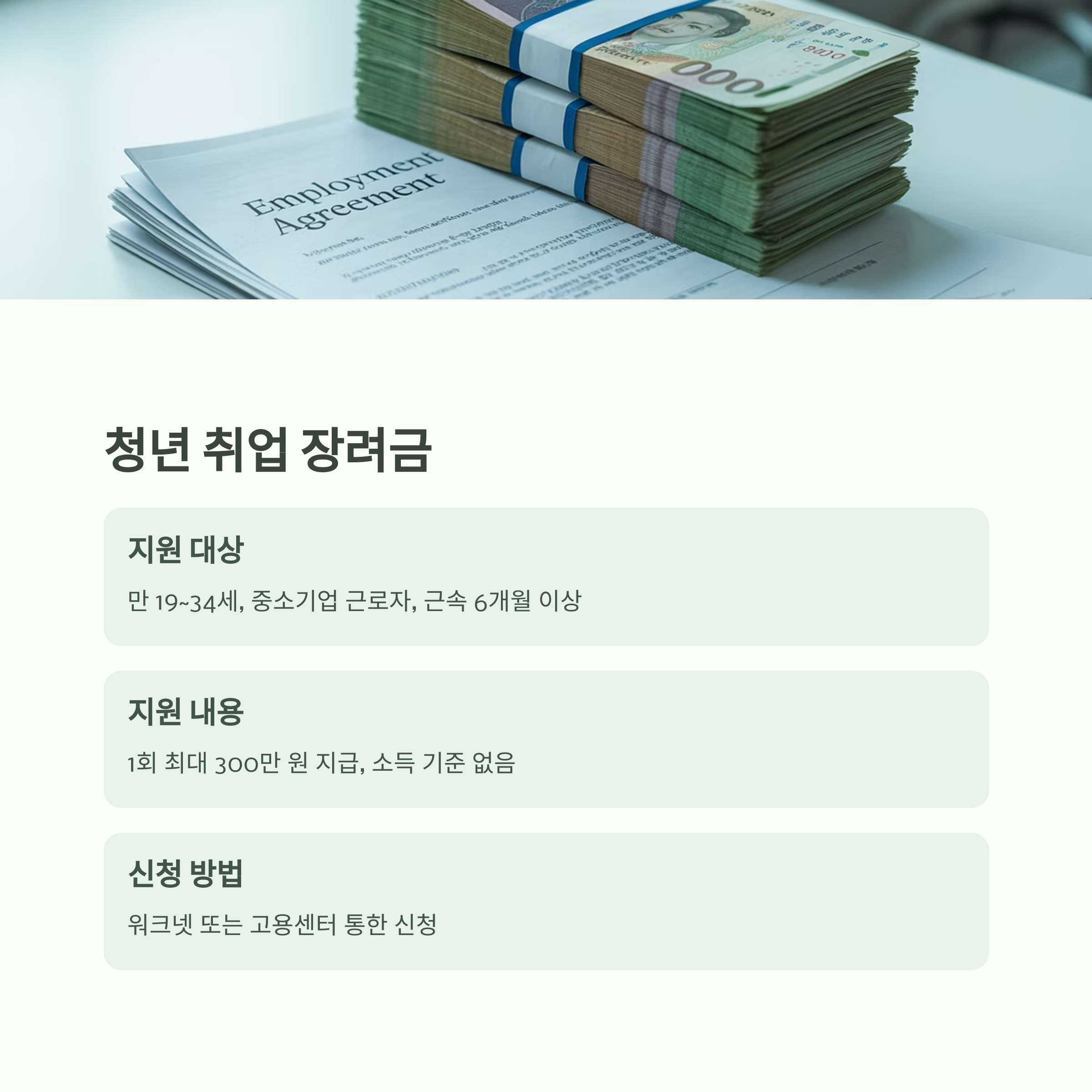 | 청년 취업 장려금 | 중소기업 근속 6개월 | 최대 300만 원 | 워크넷 / 고용센터 |
