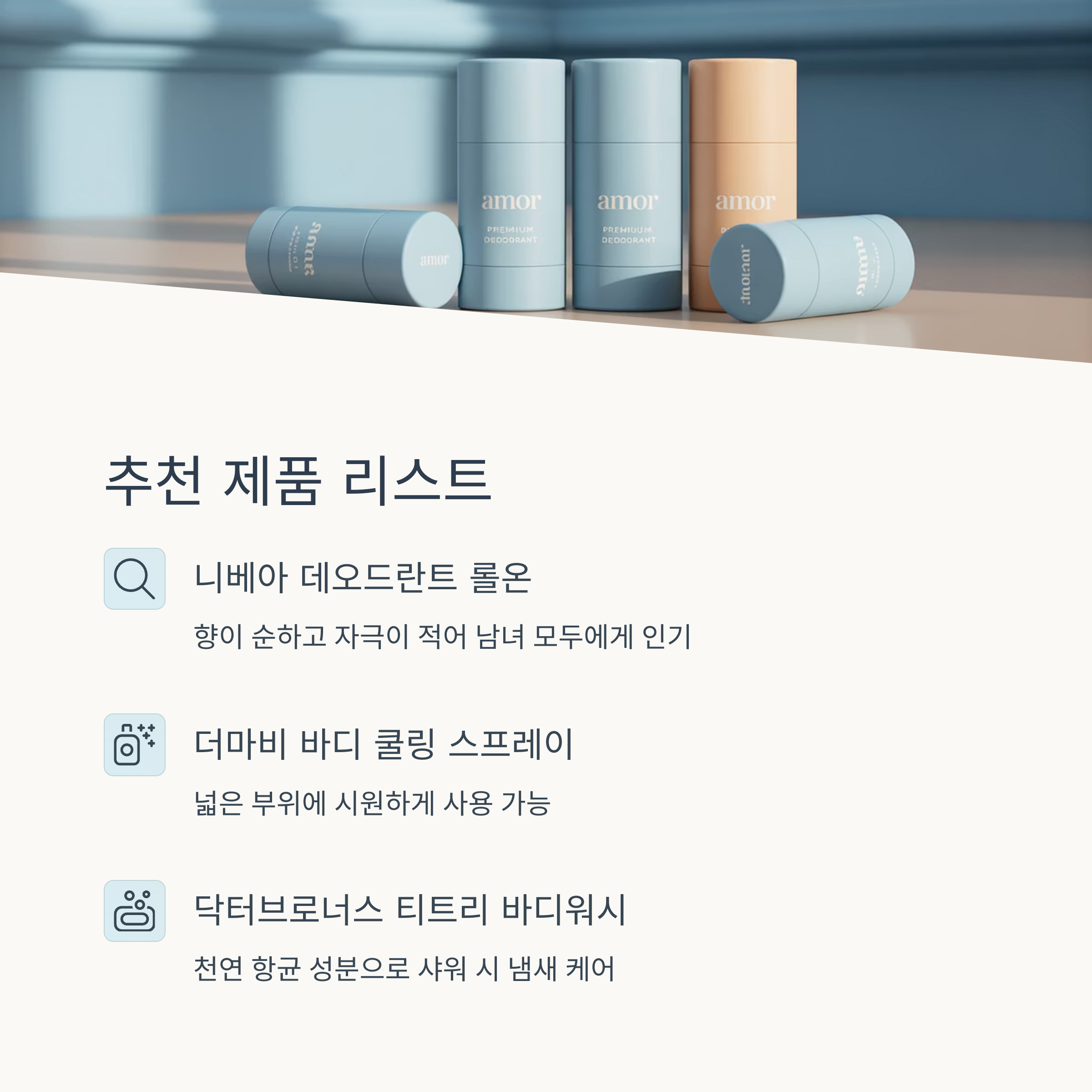 | 데오드란트 (스틱/롤온) | 냄새 억제 + 향기 부여, 사용 간편 | 출근 전 빠르게 사용하려는 분 |