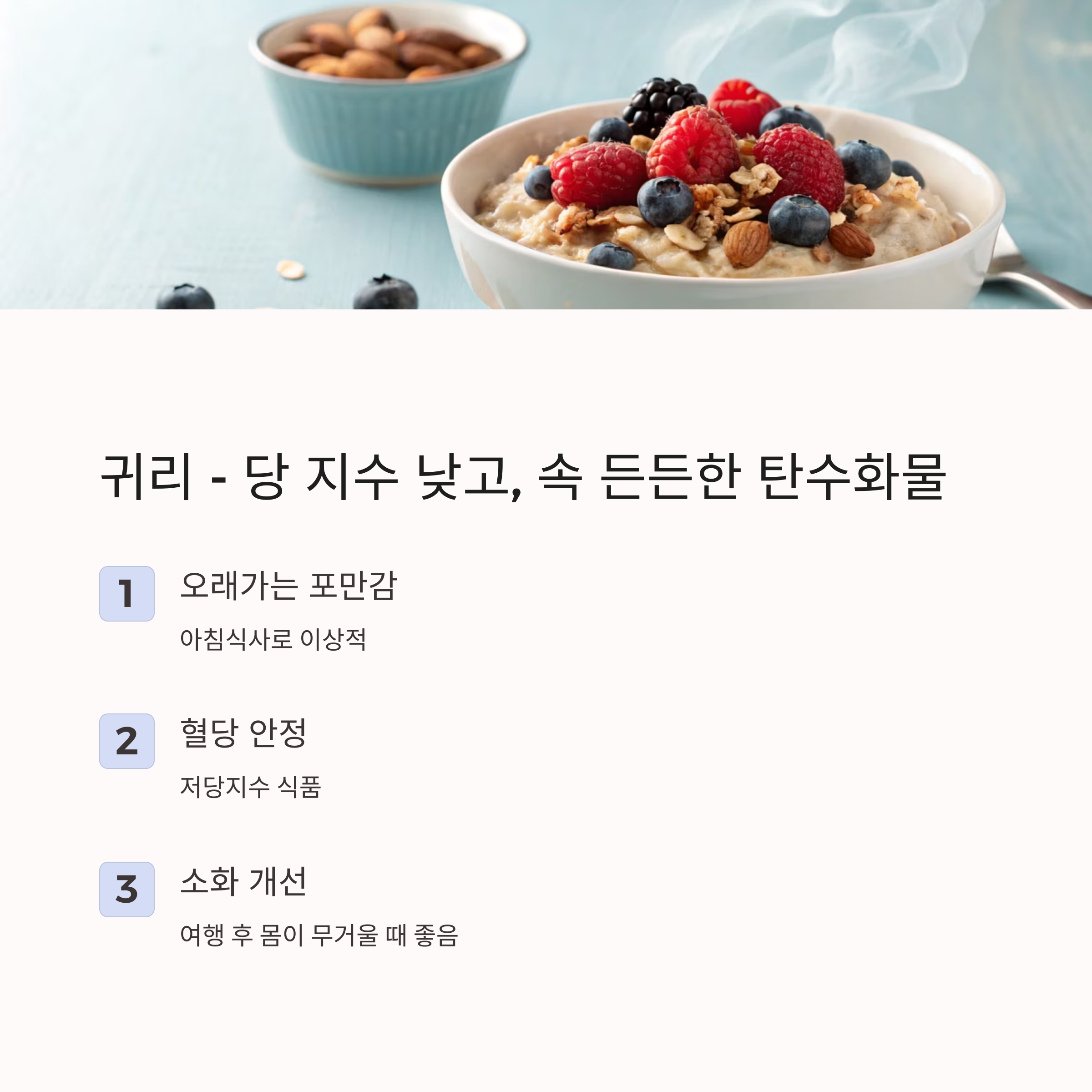 아침에 귀리죽이나 귀리밥을 먹으면 포만감은 오래가고 혈당도 안정됩니다. 여행 후 몸이 무겁고 소화가 안 될 때 특히 좋아요.