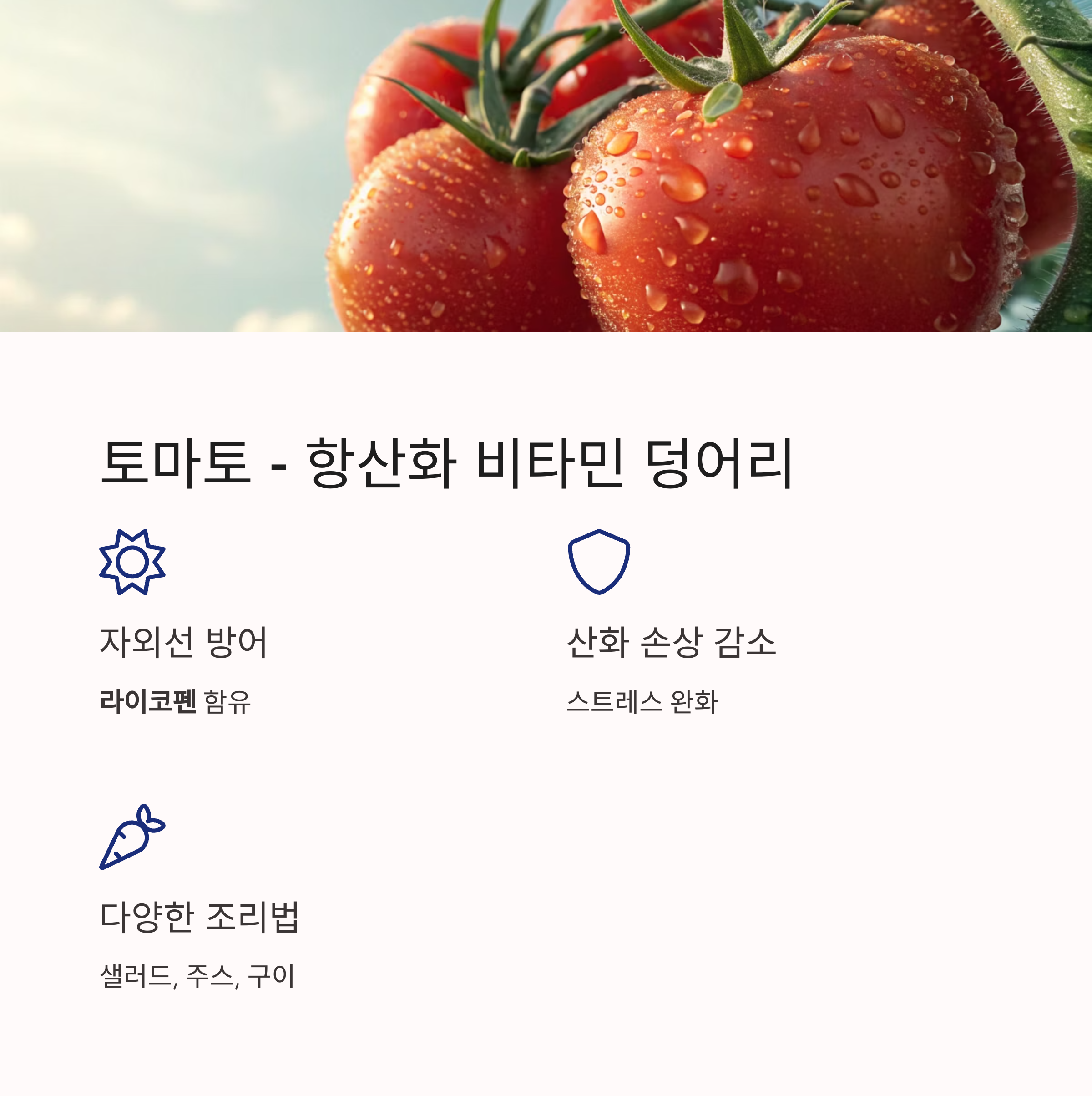토마토 속 라이코펜은 자외선, 스트레스 등으로 인한 산화 손상을 줄여줍니다. 샐러드, 주스, 구이 등 다양하게 활용하세요.