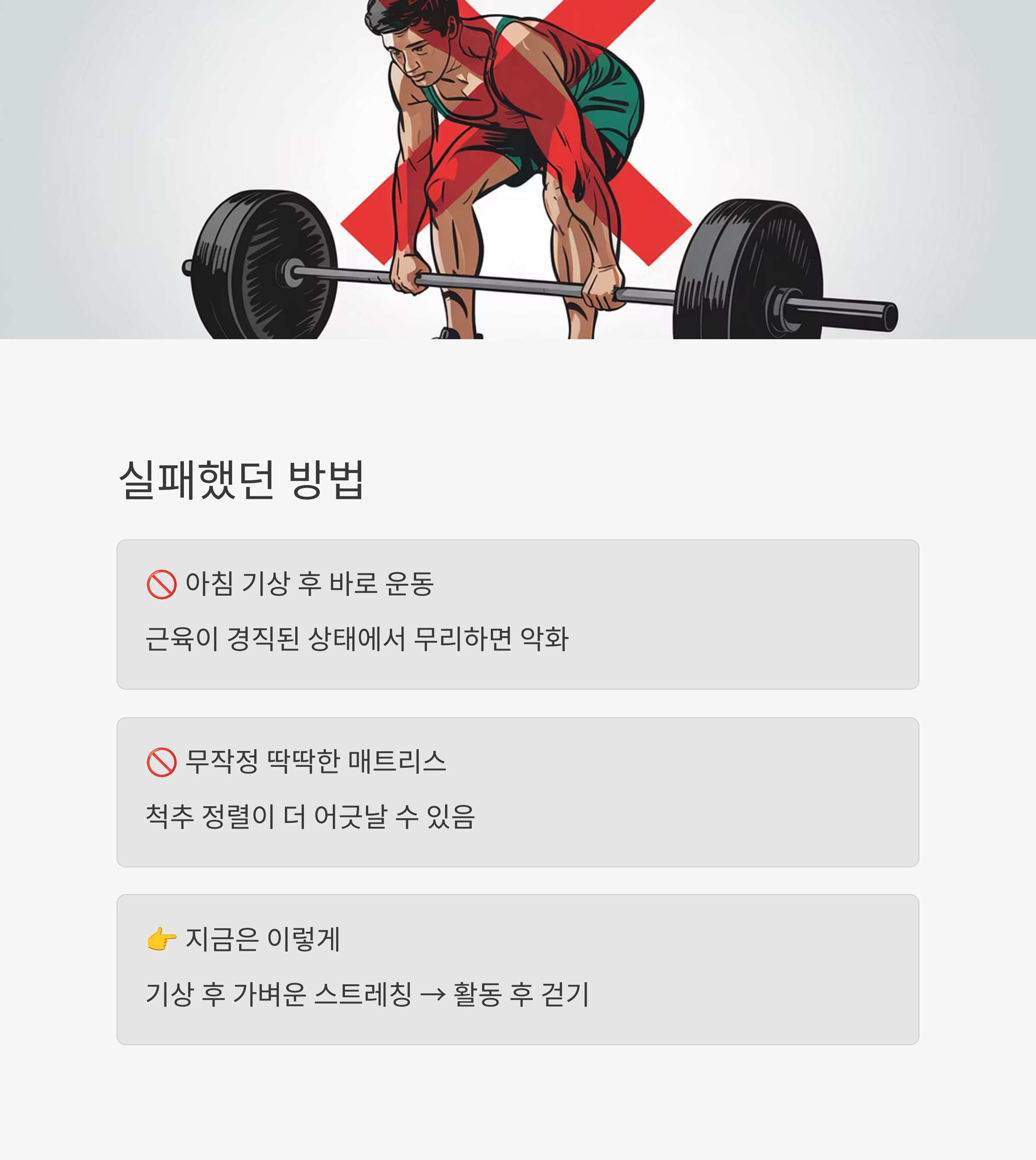 - 🚫 아침 기상 후 바로 운동: 근육이 경직된 상태에서 무리하면 악화