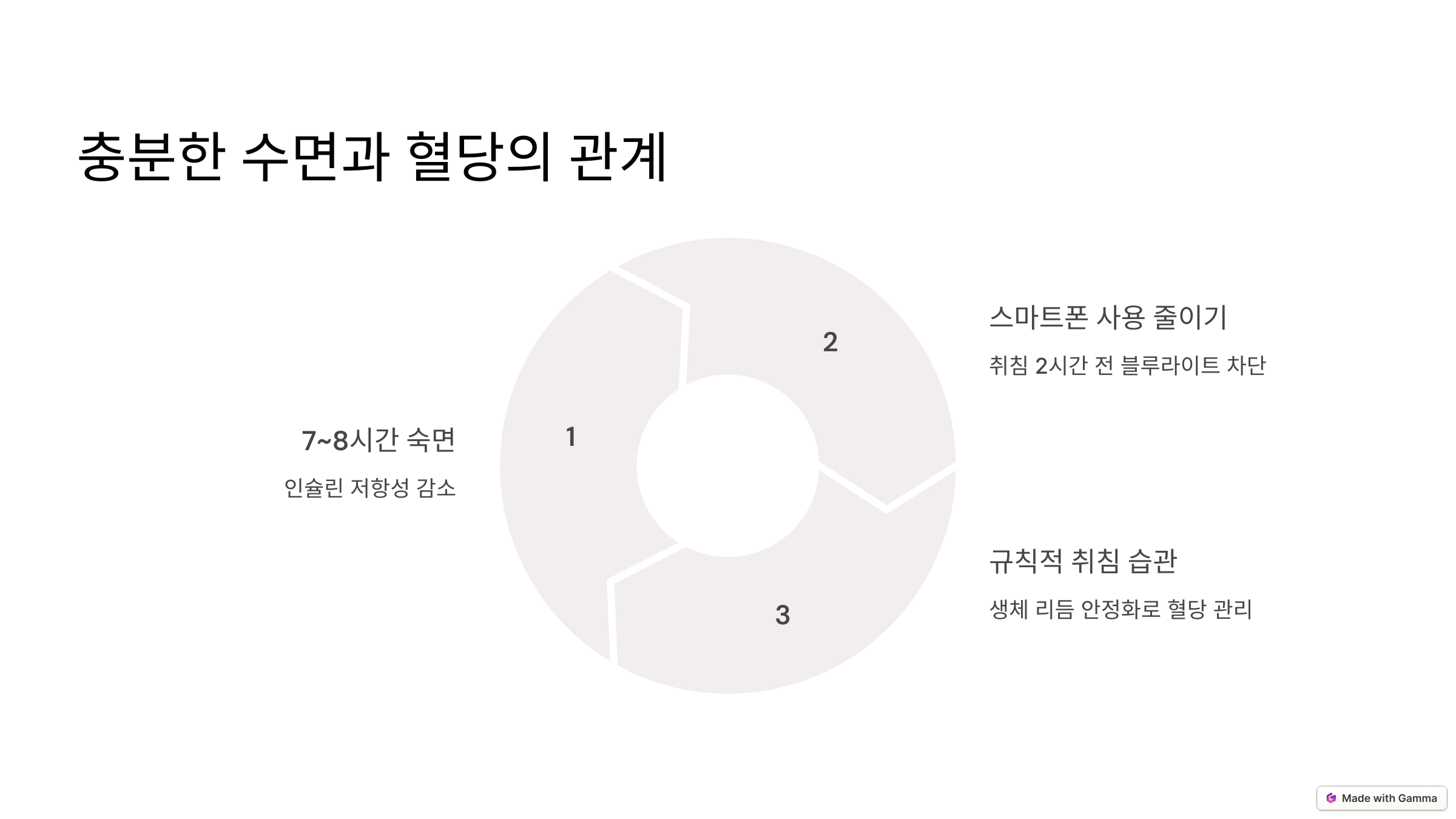 규칙적인 취침 습관 유지: 매일 같은 시간에 자고 일어나면 생체 리듬이 안정되고 혈당 관리에 도움이 돼요.