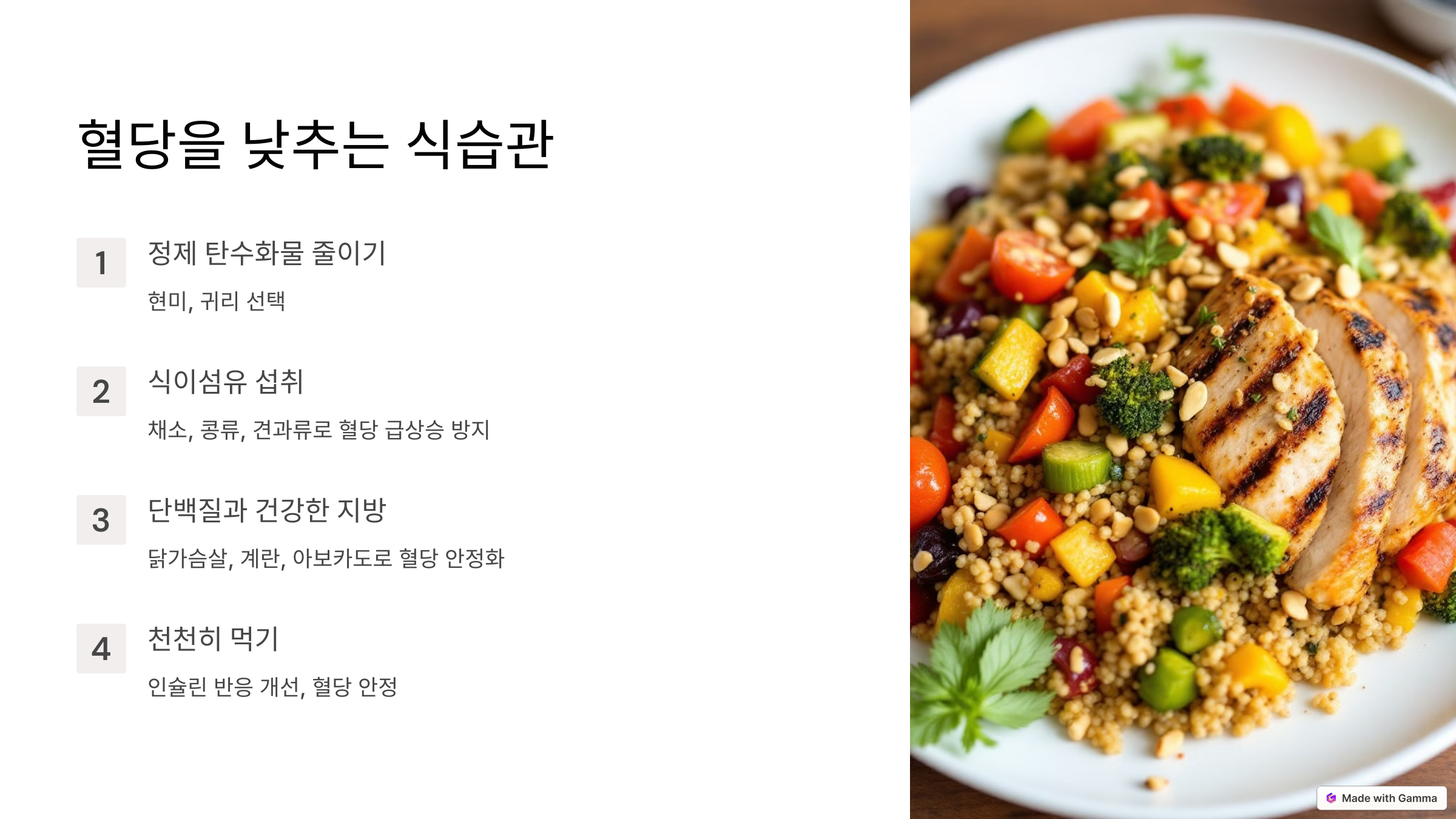 천천히 먹기: 식사 속도를 줄이면 인슐린 반응이 좋아지고 혈당이 안정적으로 유지돼요.